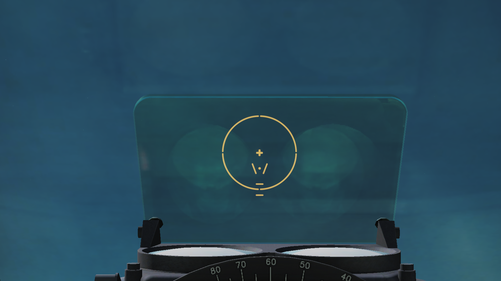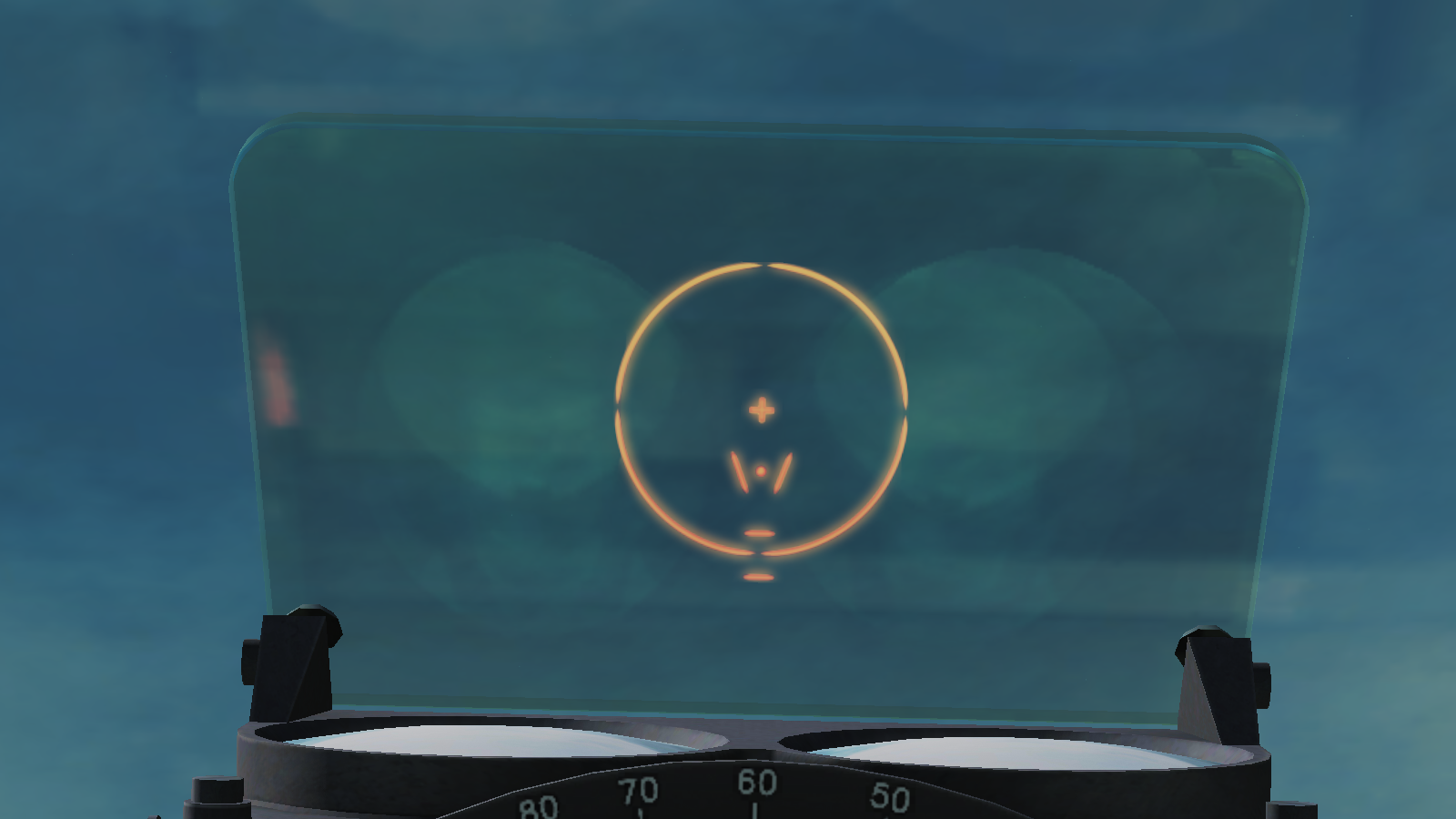 This is an edit of what I believe the sight would appear like.  While I couldn't find images of the real K-14's sight specifically, I have used a number of other gunsights from the WWII era to get the best effect I can out of this.