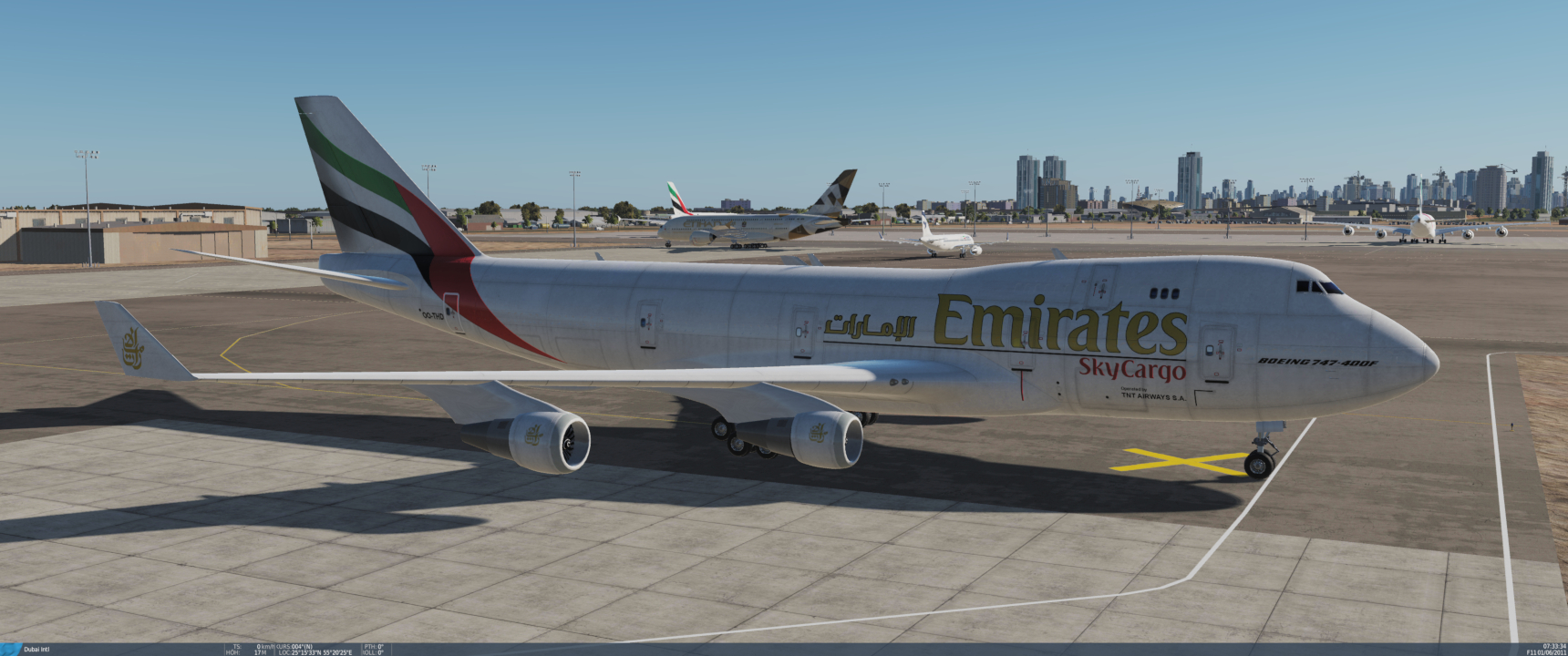 When I made the SkyCargo A320s to populate DXB, I figured that a Skycargo 747 would look cool aswell. The only way to cover the windows was a bit of the culprit. From a short distance it looks a bit weird, because the windows are still there in 3D. They're just painted over. Lol. But it looks okay for an AI plane. I figured some other users may have usage for it aswell, so here you go. :)