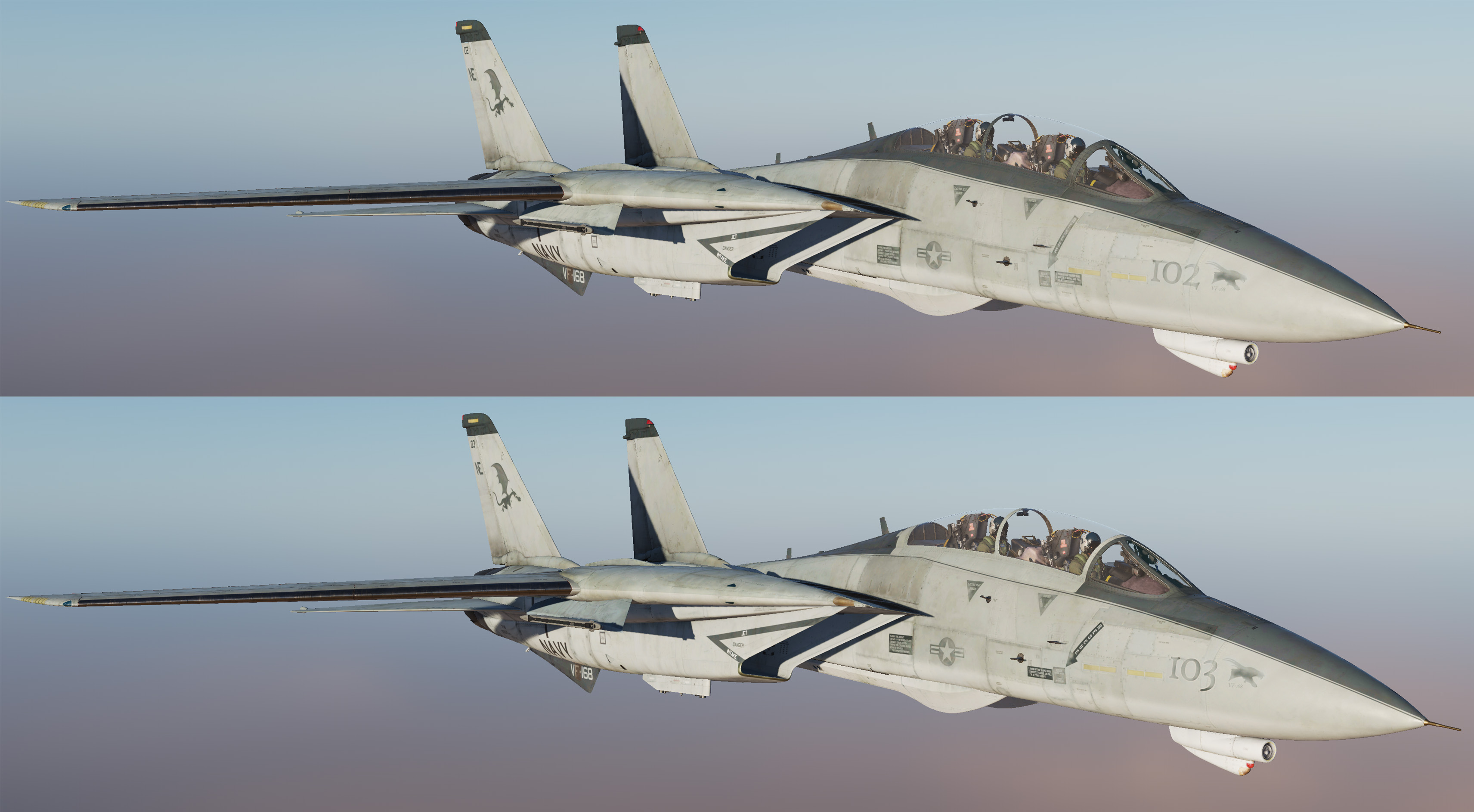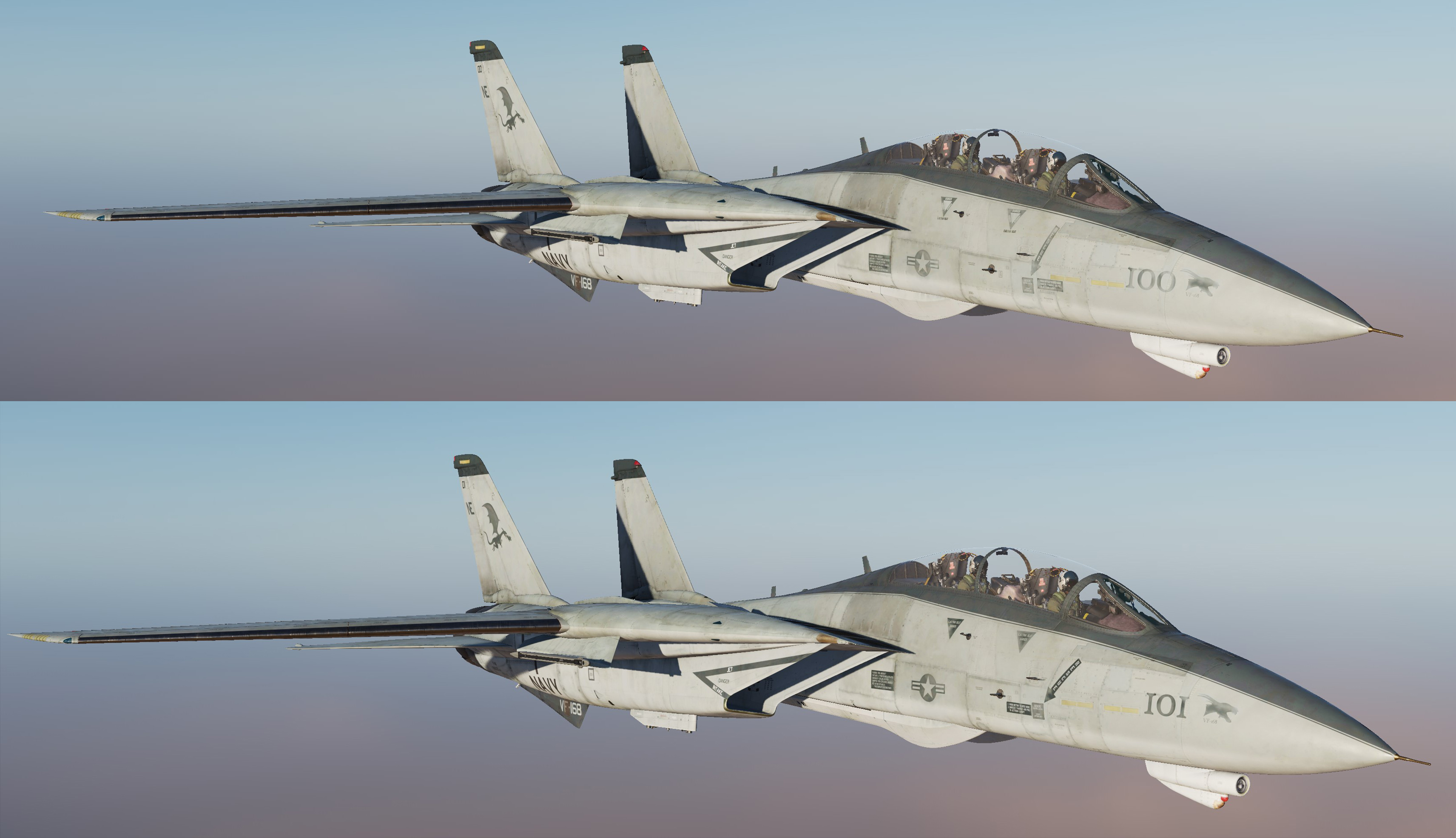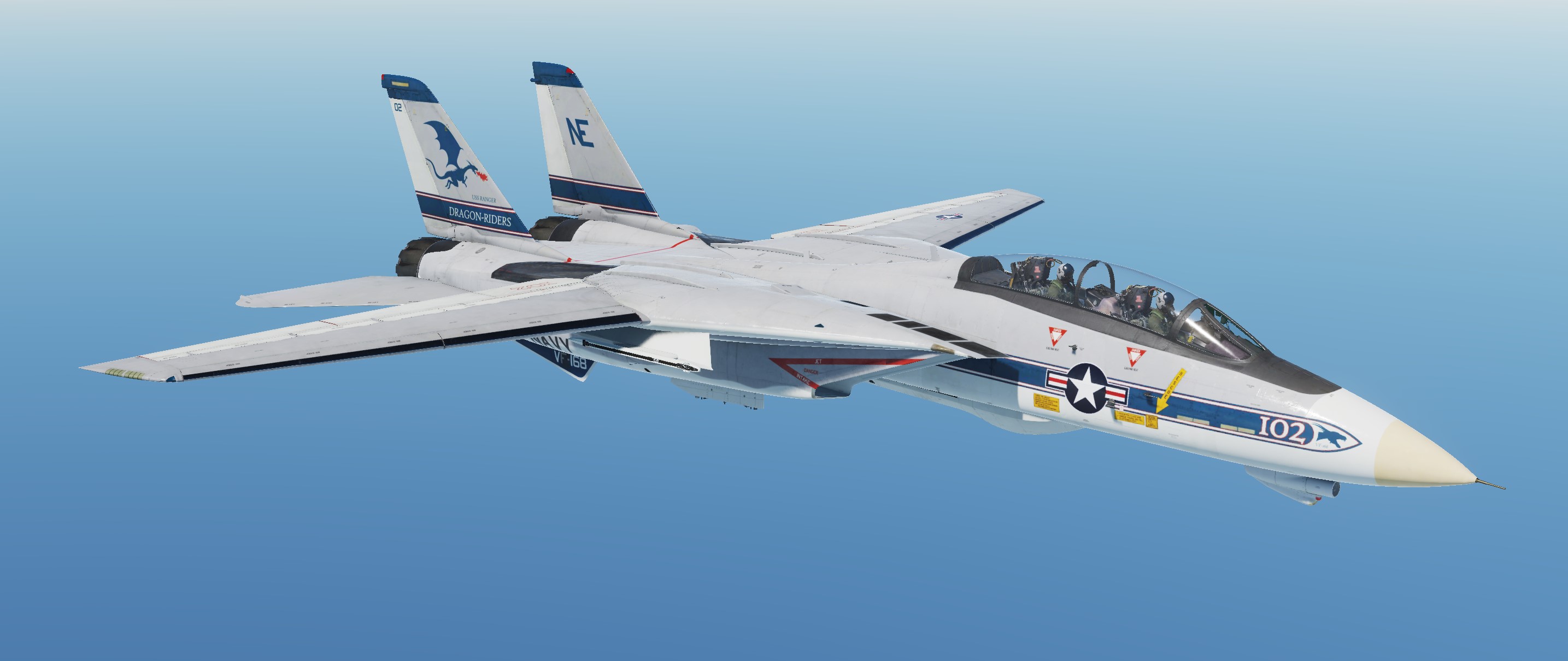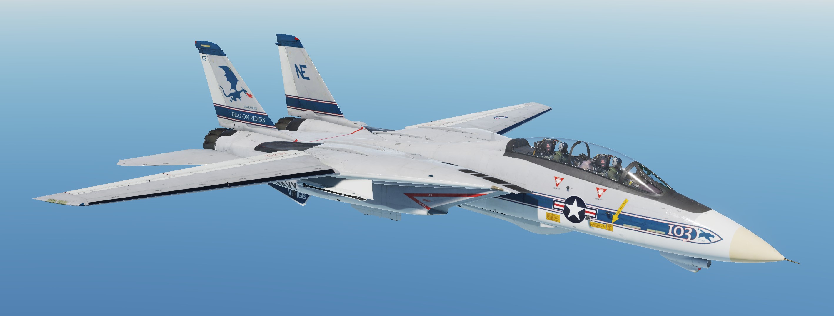 Introducing VF-168 Dragon Riders. This is a fictional skin for the F-14B Tomcat that represents MODEX numbers 100 through 103 (for Parts 1 and 2) for aircraft attached to the USS Ranger (CV-61). These are Low Visibility Tactical Schemes that depict the condition of the aircraft after a long cruise.