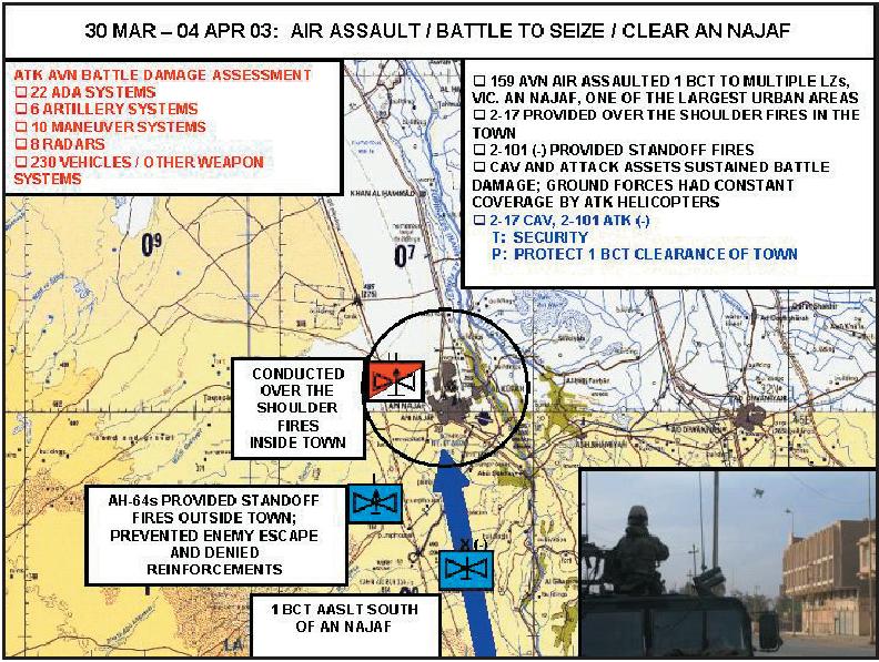 On 25 March, AH-64D Longbow Apache attack helicopters of the 11th Aviation Regiment were tasked with carrying out a long-range penetration mission against armored forces belonging to the An Najaf Division of the Iraqi Republican Guard that was stationed in Najaf. Instead of providing close air support near the front lines, helicopters would be used in a similar way to attack aircraft.