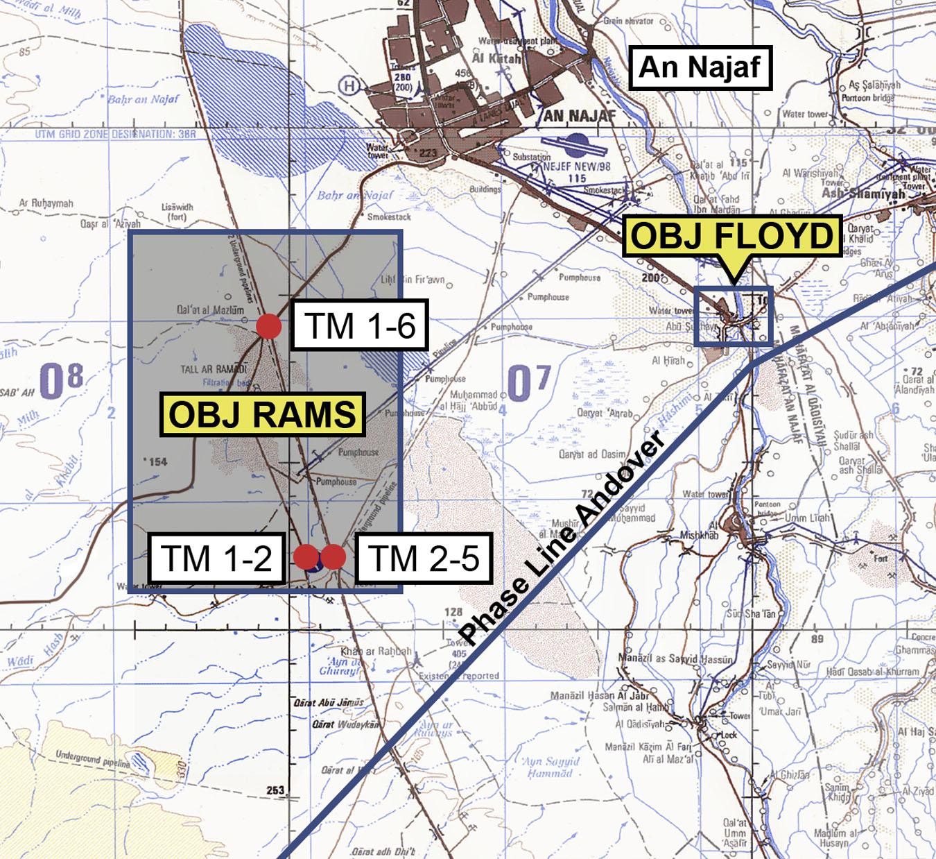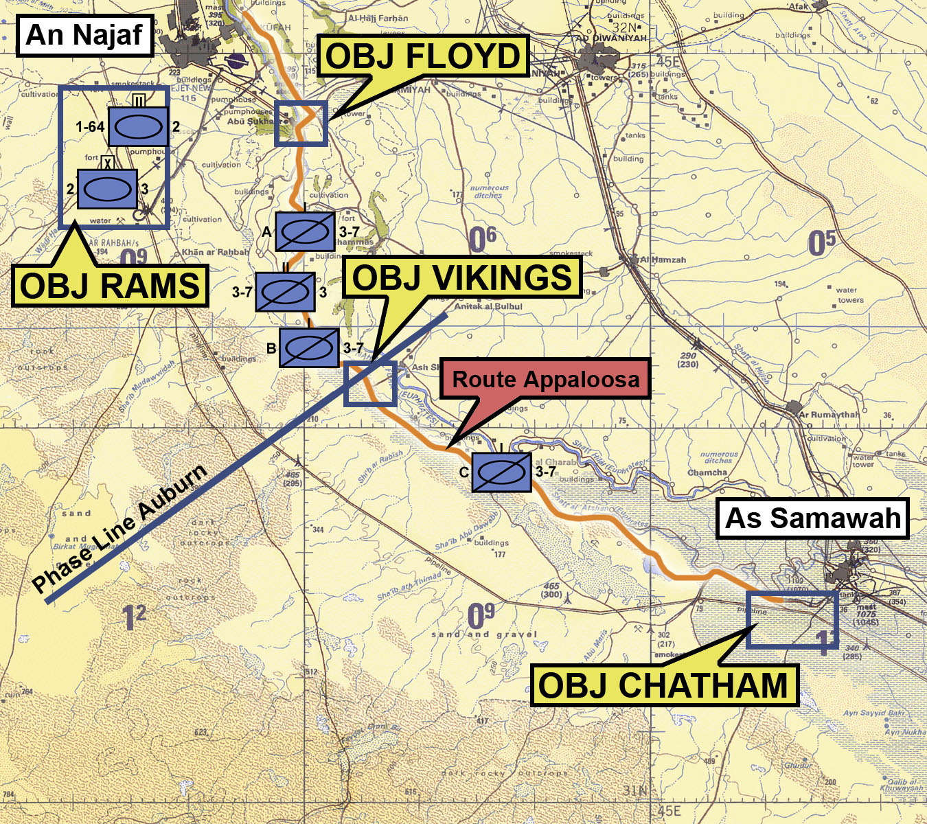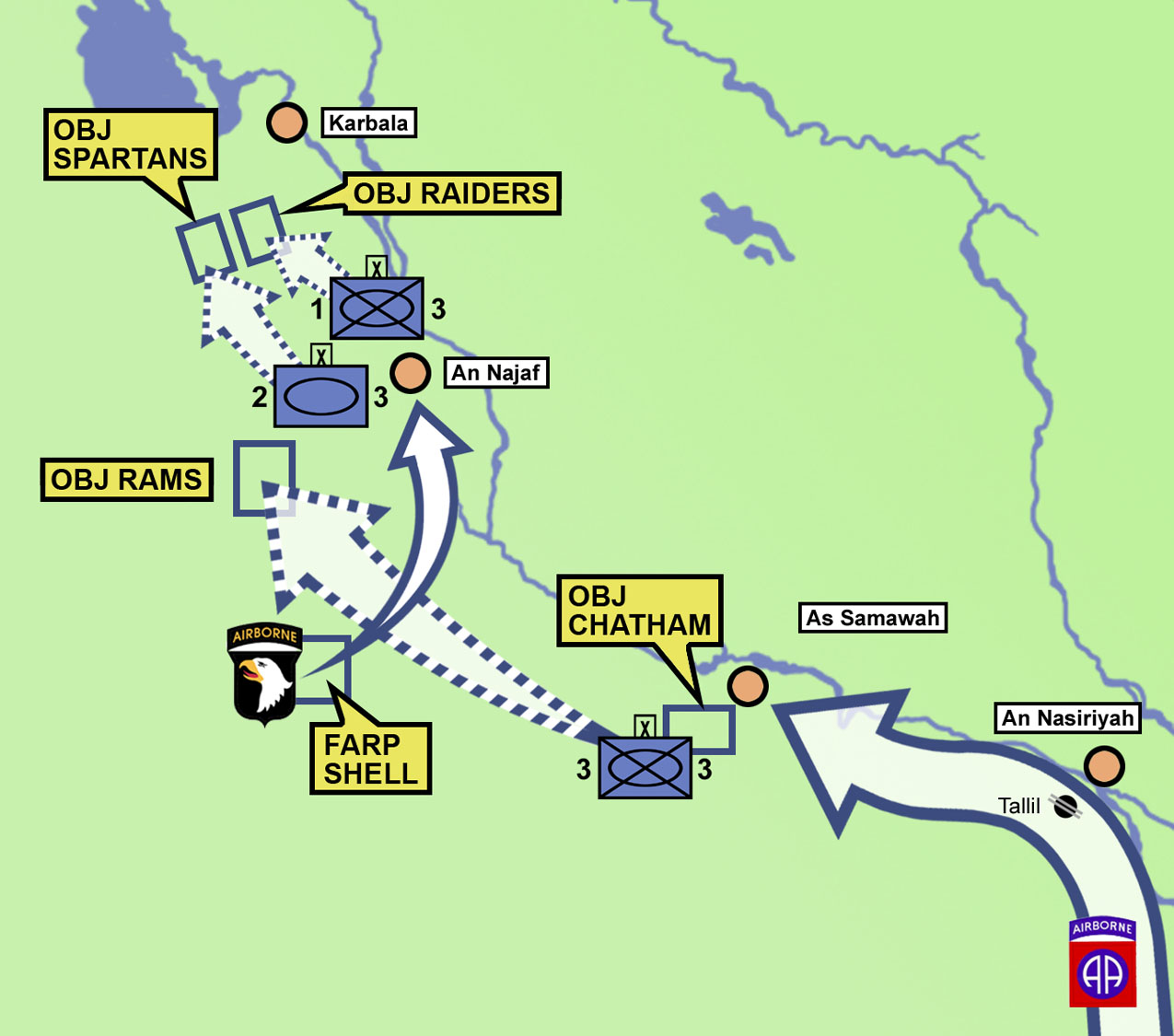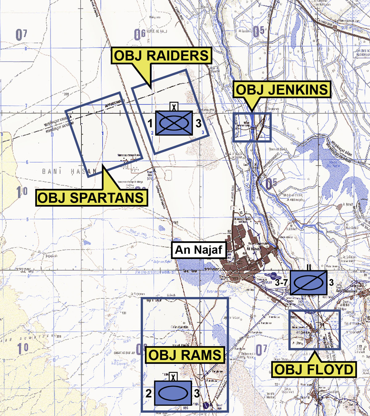 The city of Najaf sits astride important highways leading north to Karbala and Baghdad. Rather than simply bypassing the town as had been done with Nasiriyah and Samawah, the 3rd ID decided to isolate the town to prevent it from being used to stage attacks on American supply lines. The plan was to seize the major bridges in Al Kifl, a town north of Najaf, and Abu Sukhayr, a town south of Najaf. The northern bridge at Al Kifl was codenamed Objective Jenkins and the southern bridge in Abu Sukhayr was codenamed Objective Floyd.