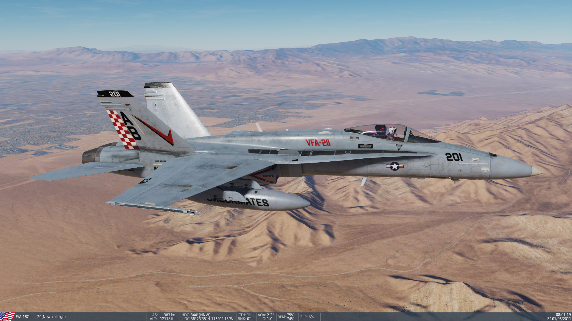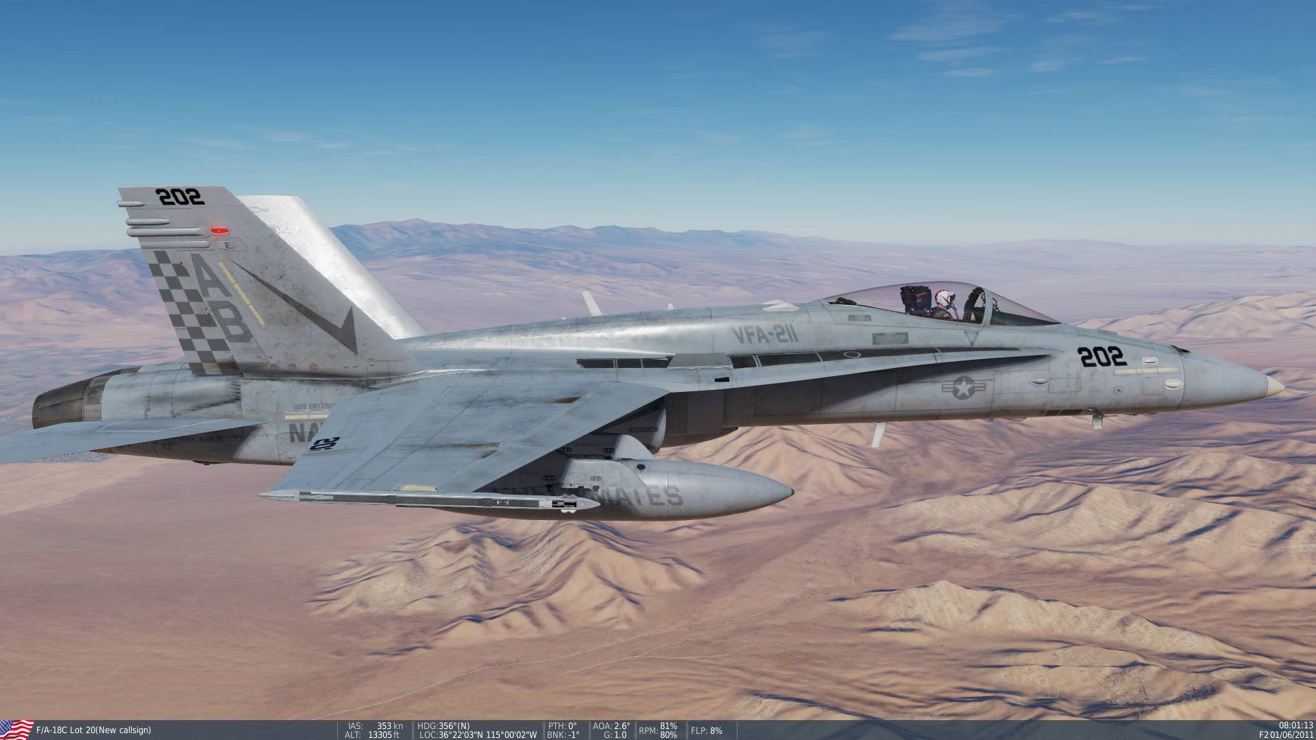 This skin pack includes CAG and CO birds from the 2012 deployment on the USS Enterprise, and are intended to complement the VMFA-251 line bird included with DCS World.  While the skins use the dynamic MODEXes (side numbers), the MODEXes for these skins were historically in the 400 series (400 for CAG and 401 for CO).  Each skin has a "normal" version and a weathered version.  Weathered skins have a bleached effect as if the aircraft were heavily exposed to the sun for months on end.  Normal skins include pilots with green flightsuits, while weathered skins include pilots with desert flightsuits.  Note: this skin pack is distributed as an EXE installer.