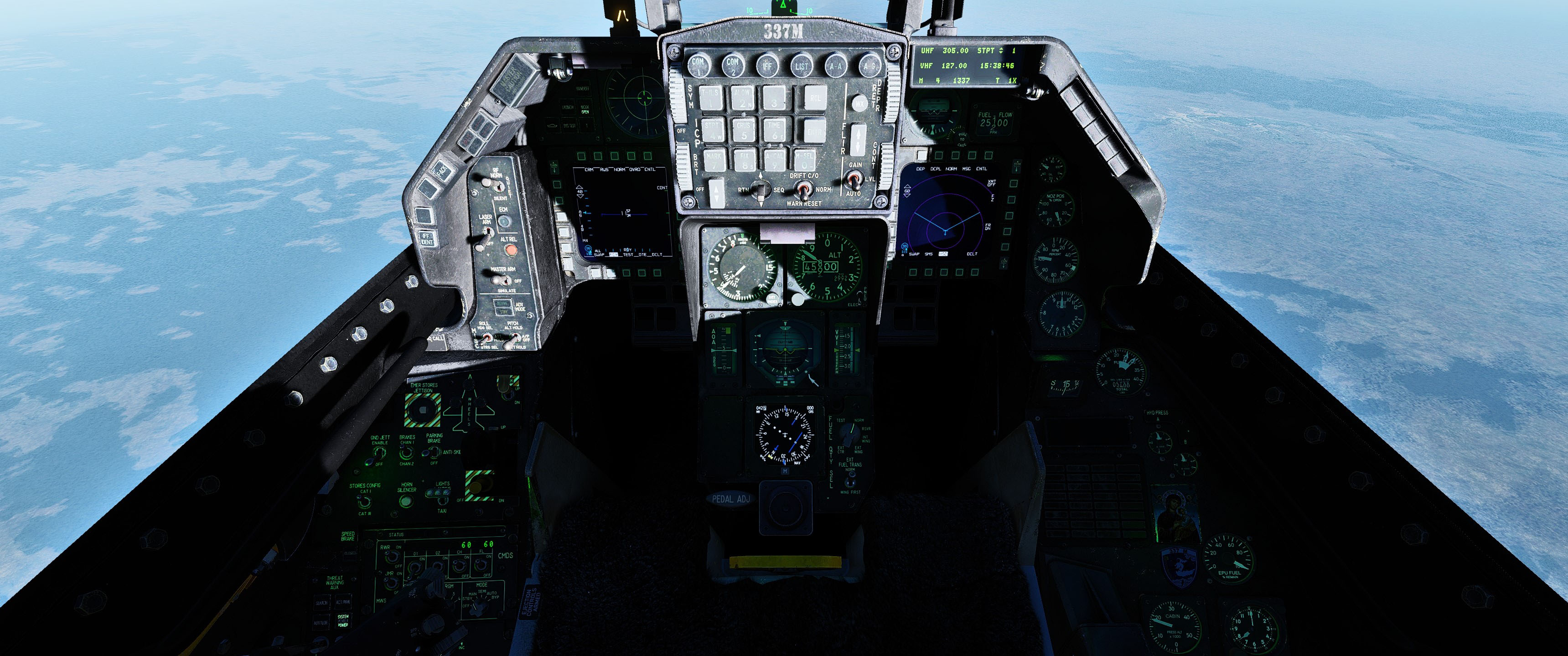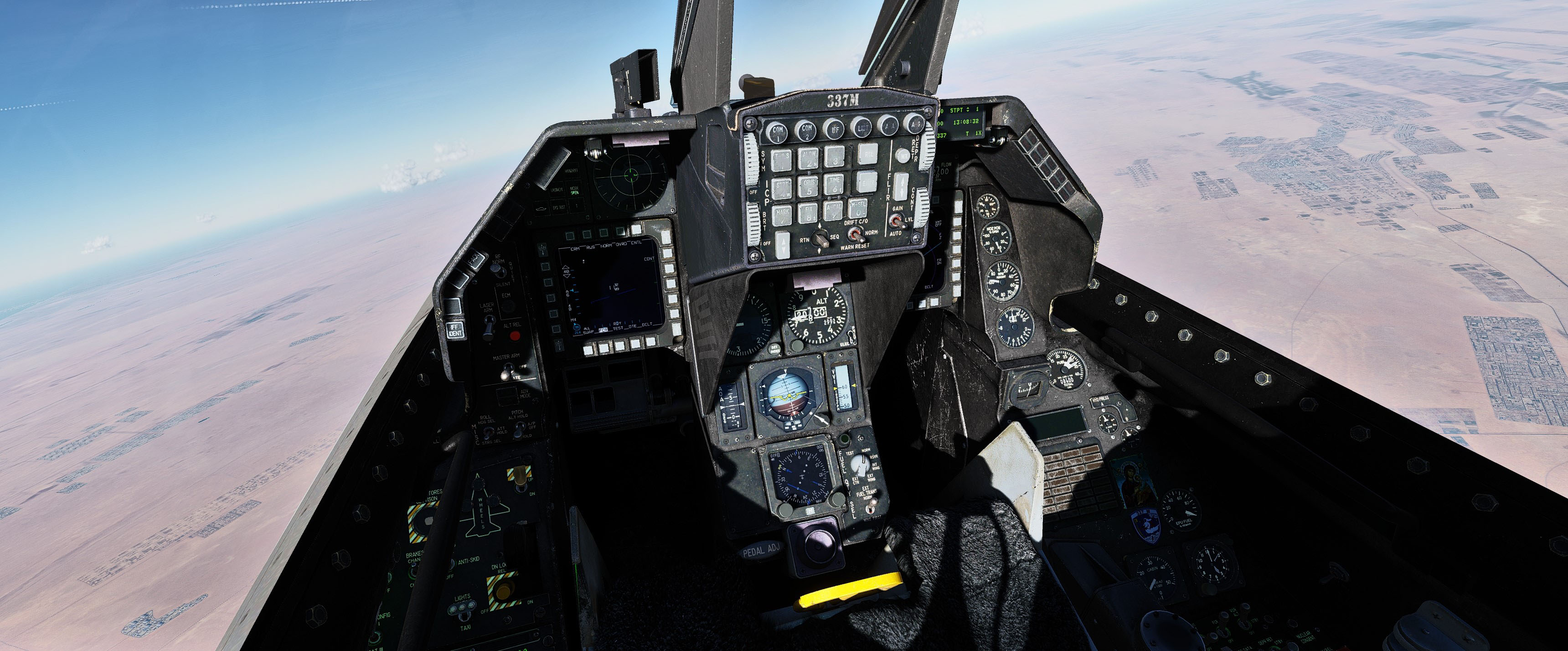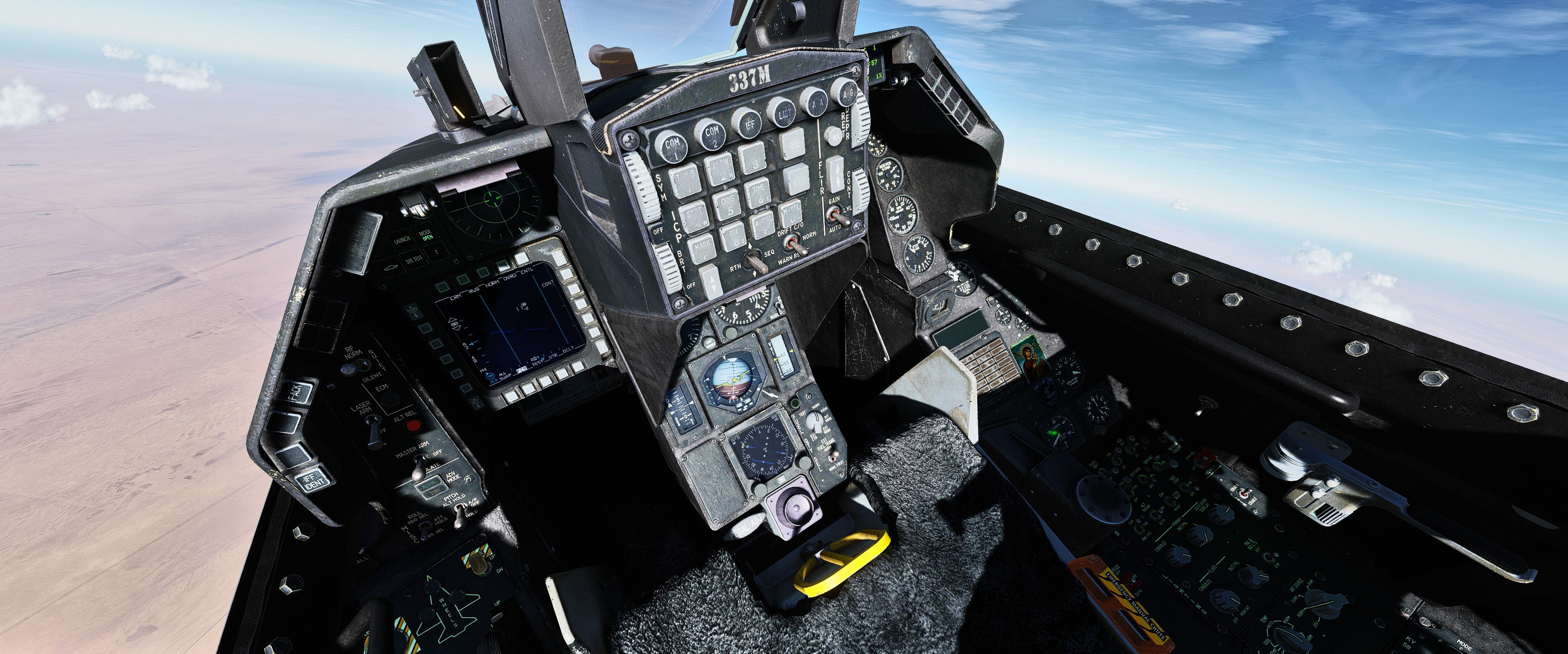 This is a cockpit mod for the F-16C which features darker textures and some little details that represent the Hellenic Air Force's 337 squadron "Ghost", which is tasked and dedicated to the Air Intercept mission. MFDs textures have been edited to have some LCD feel which improves visibility. Corrected some errors that exist in the default cockpit. Added light weathering on ICP buttons.