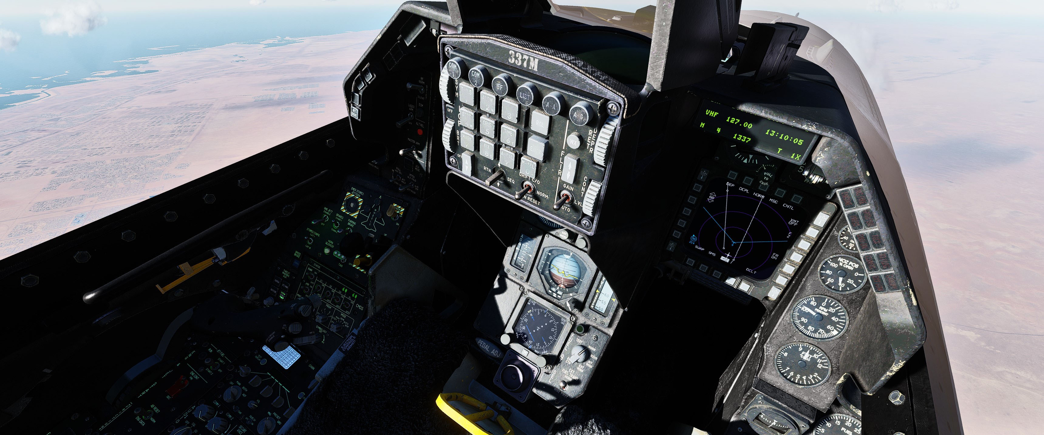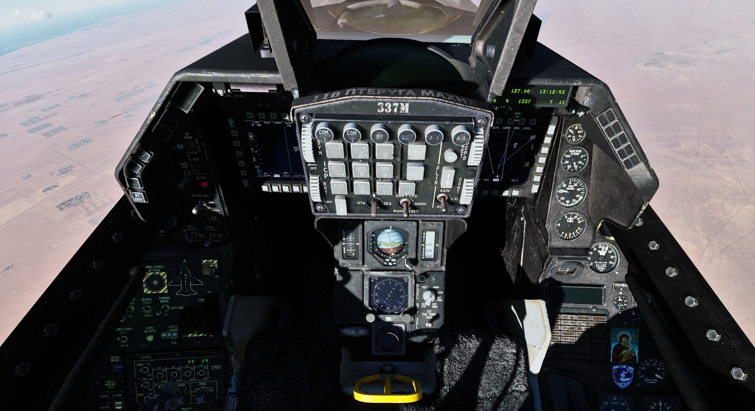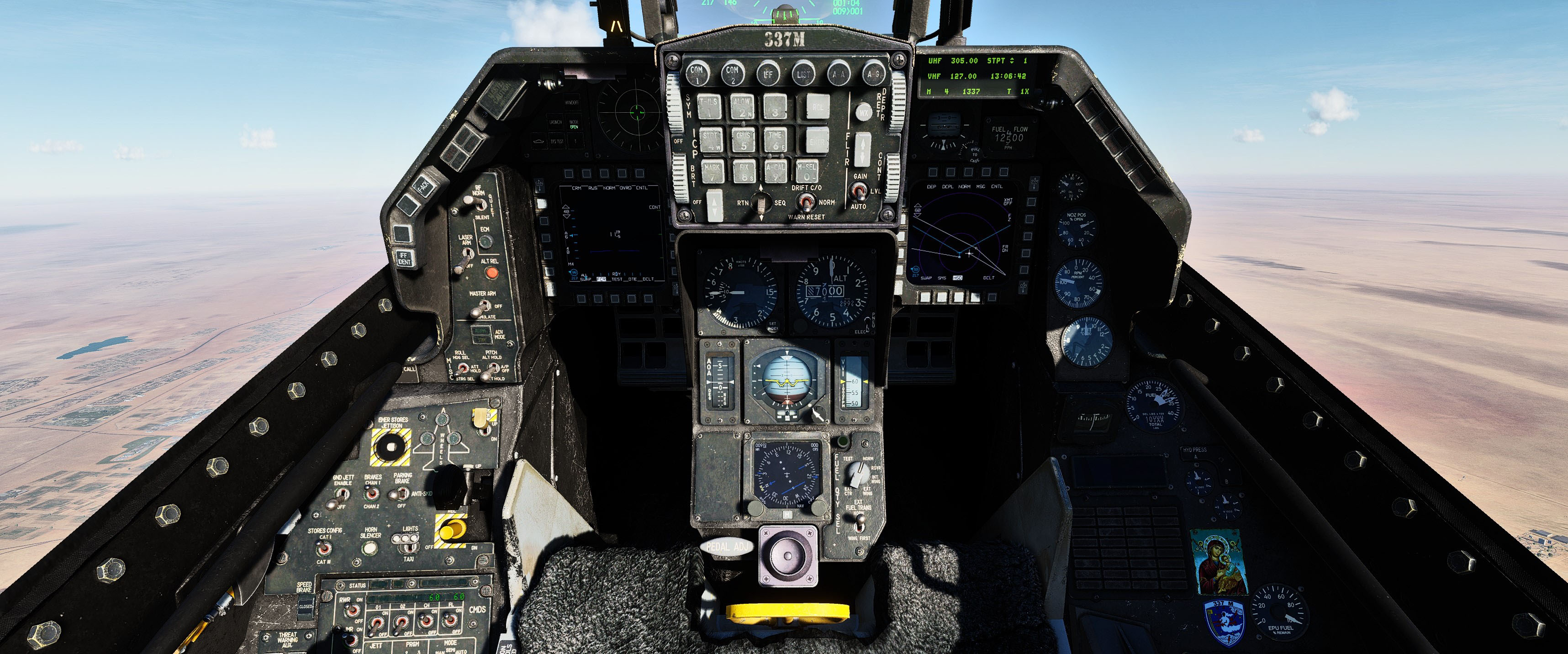 This is a cockpit mod for the F-16C which features darker textures and some little details that represent the Hellenic Air Force's 337 squadron "Ghost", which is tasked and dedicated to the Air Intercept mission. MFDs textures have been edited to have some LCD feel which improves visibility. Corrected some errors that exist in the default cockpit. Added light weathering on ICP buttons.