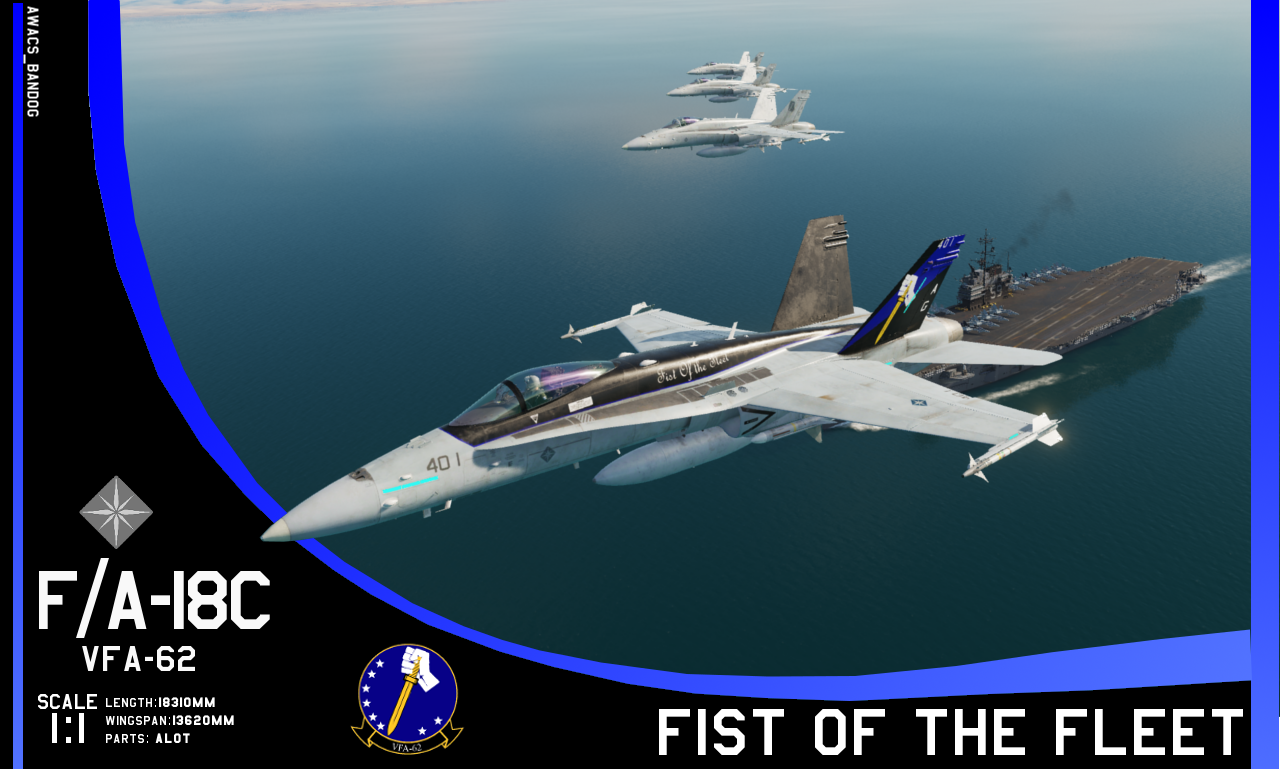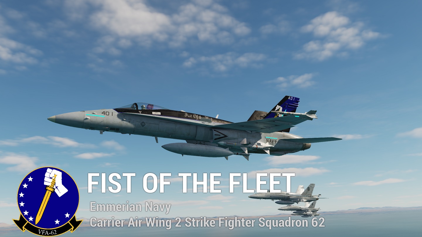 Established in the late 1960s flying the A-7 Corsair, Attack Squadron 62 "Fist of the Fleet" would be a staple within the Emmerian Naval Reserves, often attached to Carrier Air Wing 2 in San Loma. Deploying twice in 1972, and 83, the squadron would notably earn the Distinction of winning the Aurelius award in 1984, for most spirited squadron in the Navy. In 1988, the squadron would upgrade to the F/A-18C, and would make a deployment to Sapin in 1996 supporting the No Fly Zone operations over Belka at that time.