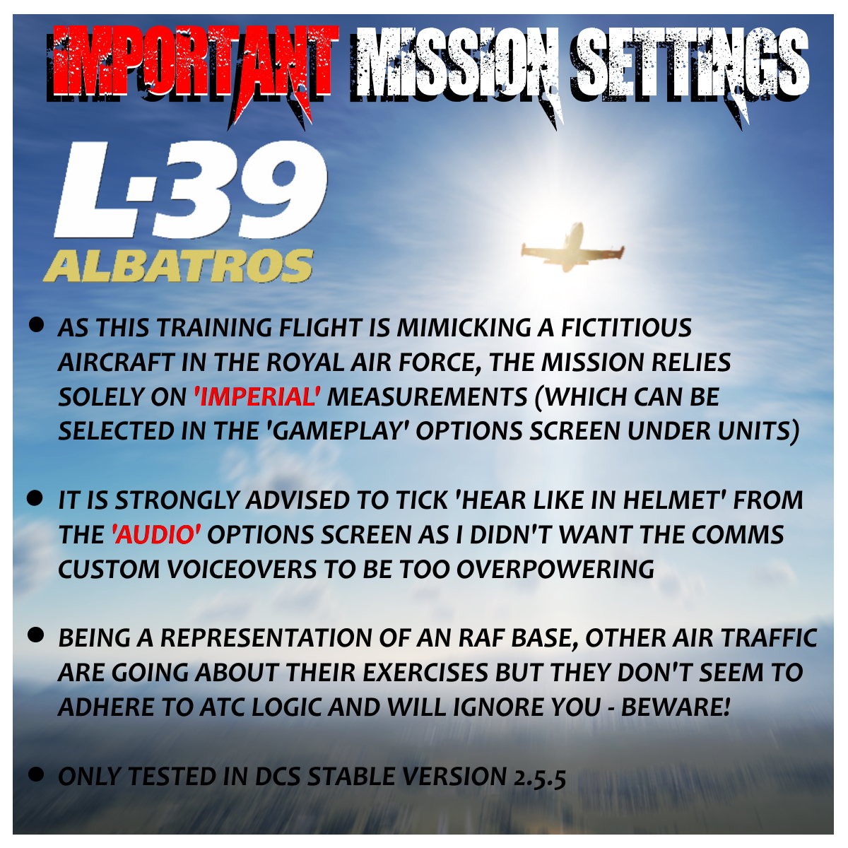 L-39C Albatros: StartUp and Basic Circuits Training Mission - Start Up and Basic Circuit training with custom mission-specific Kneeboards and instructor voiceovers by skybaby68.<br /><br /><br /><br /><br />
