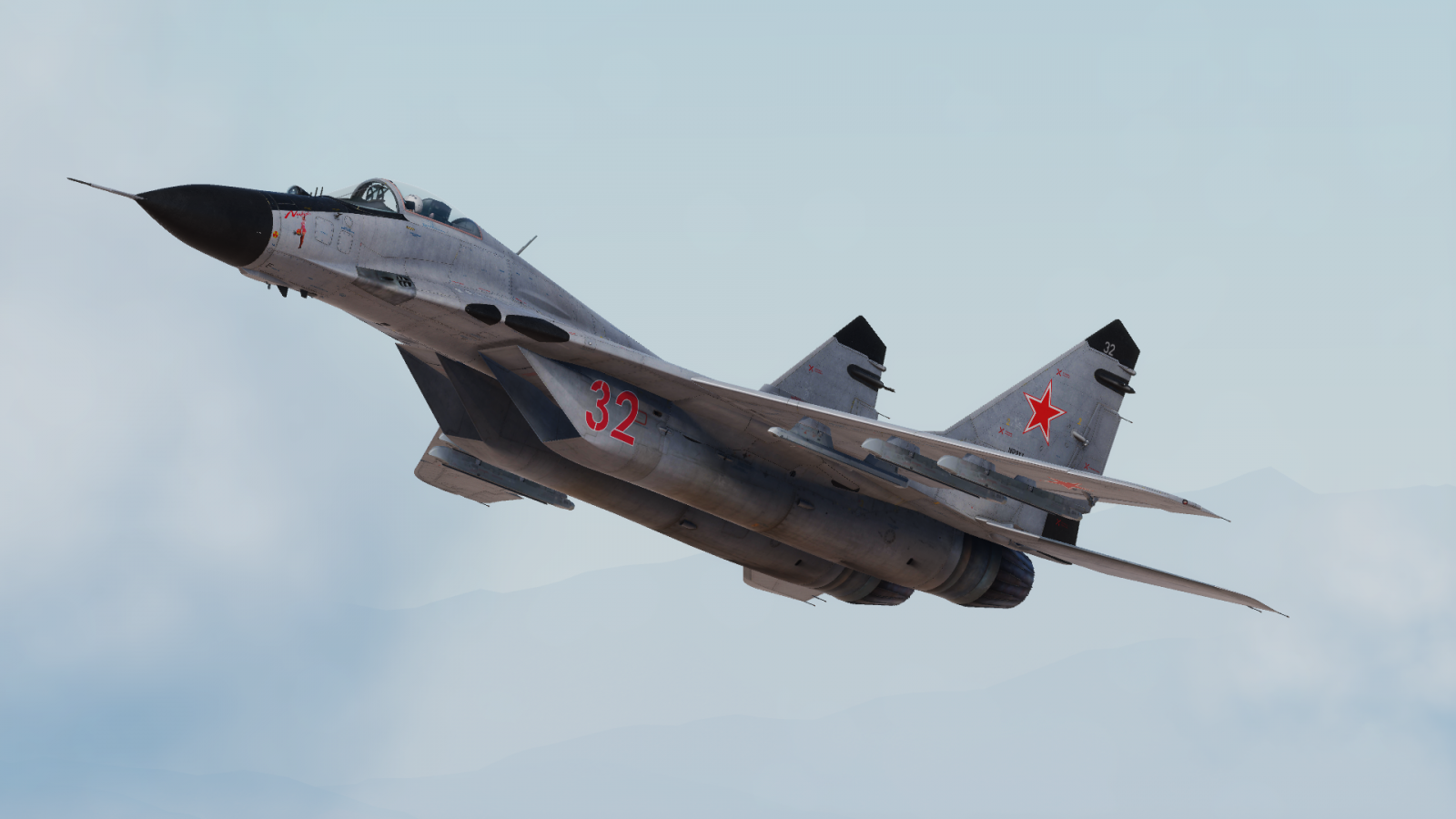 Don Kirlin's airworthy MiG-29UB with its early "Natasha" paint scheme, represented in-game with the MiG-29A. Available to the USAF Aggressor faction, use with bort 32 for maximum realism.