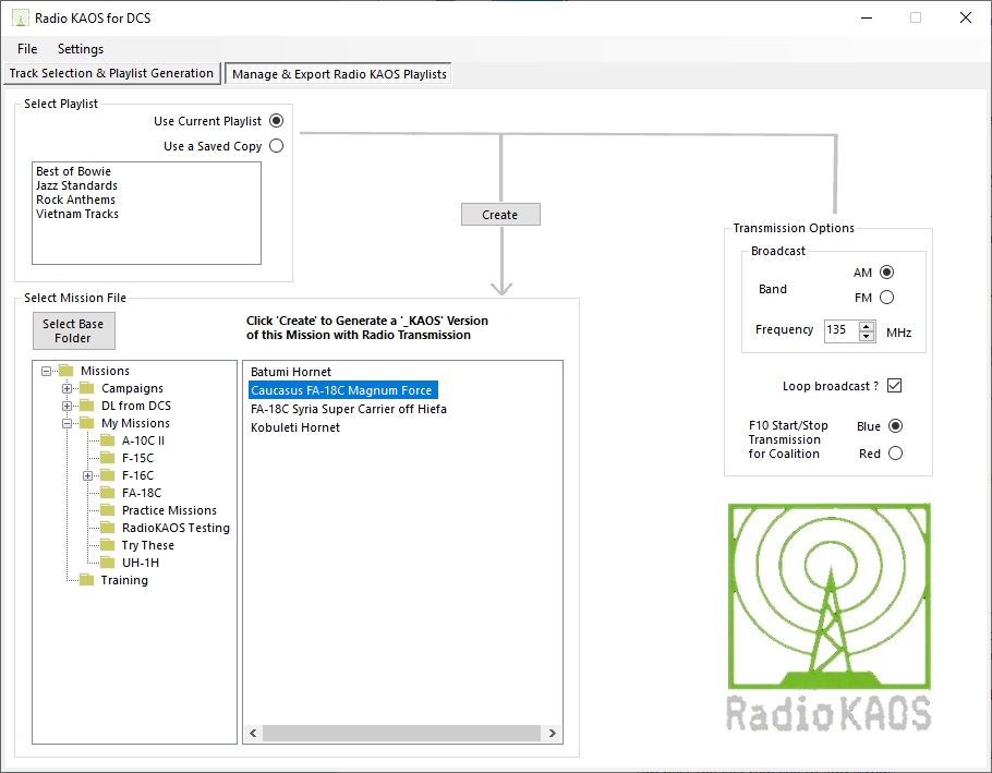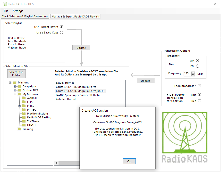 Radio KAOS for DCS is a utility which makes it possible to generate and listen to your own audio playlists, in mission, without breaking immersion, by using the aircraft cockpit radios. It’s intended as an occasional “add-on” to any DCS mission.