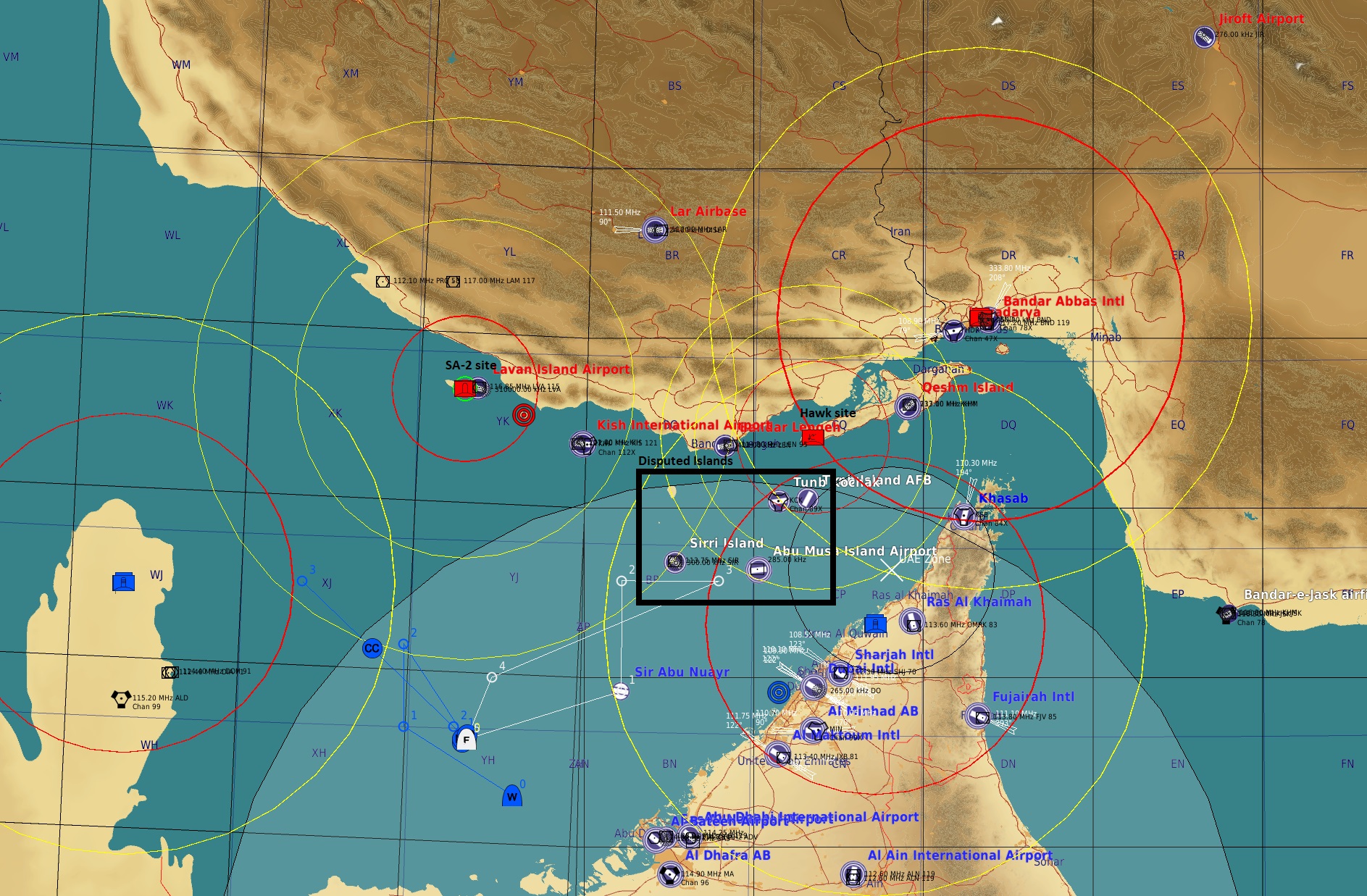 Fly a 2 ship F-14 CAP over the Strait of Hormuz. Enforce a no fly zone over the disputed islands of the region. More details in briefing.
