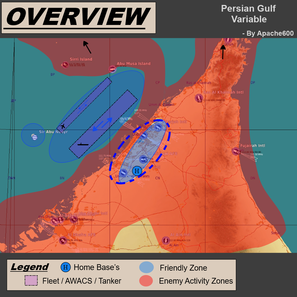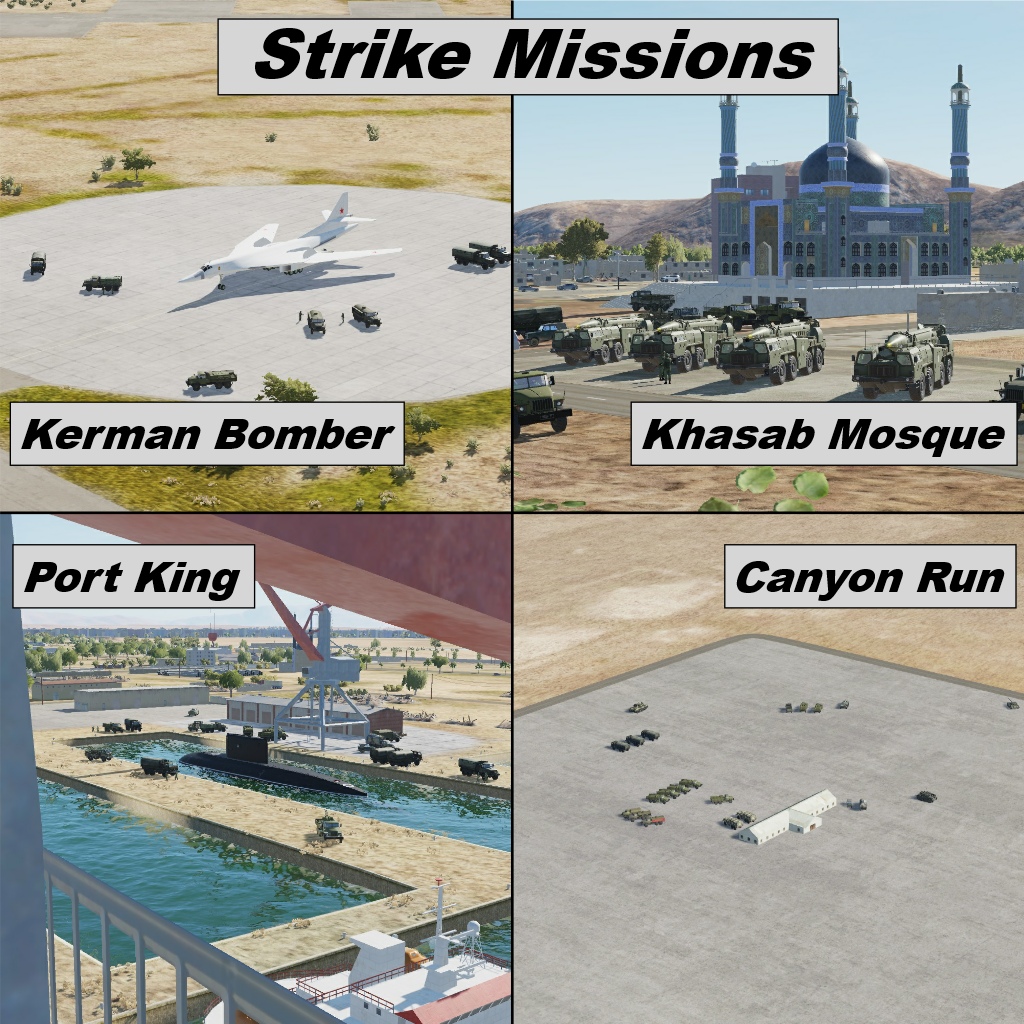 This is an all-in-one style Air-Ground, Air-Air attack mission for the Persian Gulf map, and supports every flyable platform in DCS.  There are over 50 different missions that can be played inside this one mission.  In order to activate a mission, you MUST select it through the F10 radio menu option.  Once completed with a mission, you will have the option of selecting a new mission.   If you selected a mission that you no longer wish to complete, or have selected a mission in error, you can use the "Auto-complete" radio option to delete the units and go back to the main menu.    ** NOTE - if you select the "auto-complete" option, you can no longer attack that missions units in the future. **