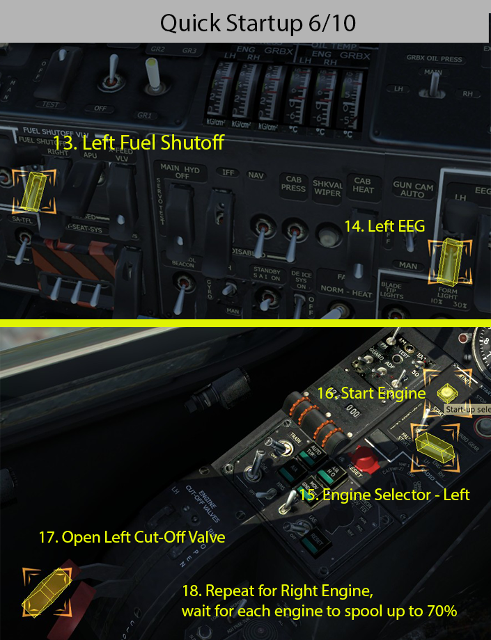 Single Mission where an Instructor Pilot (IP) calls out Start up Checklist items and you have to locate and enable the item within 10 seconds to score.