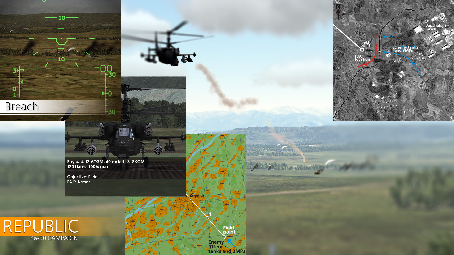 "Republic" è una campagna inedita che ti mette nei panni di un pilota dell'elicottero da attacco Black Shark. La campagna non è lineare ed è composta da archi narrativi che si ramificano in base ai tuoi risultati di missione. La campagna è composta da 15 fasi, che comprendono 18 missioni di vario tipo: supporto aereo, anti-carro, interazione con FAC, operazioni speciali anche dietro le linee nemiche.