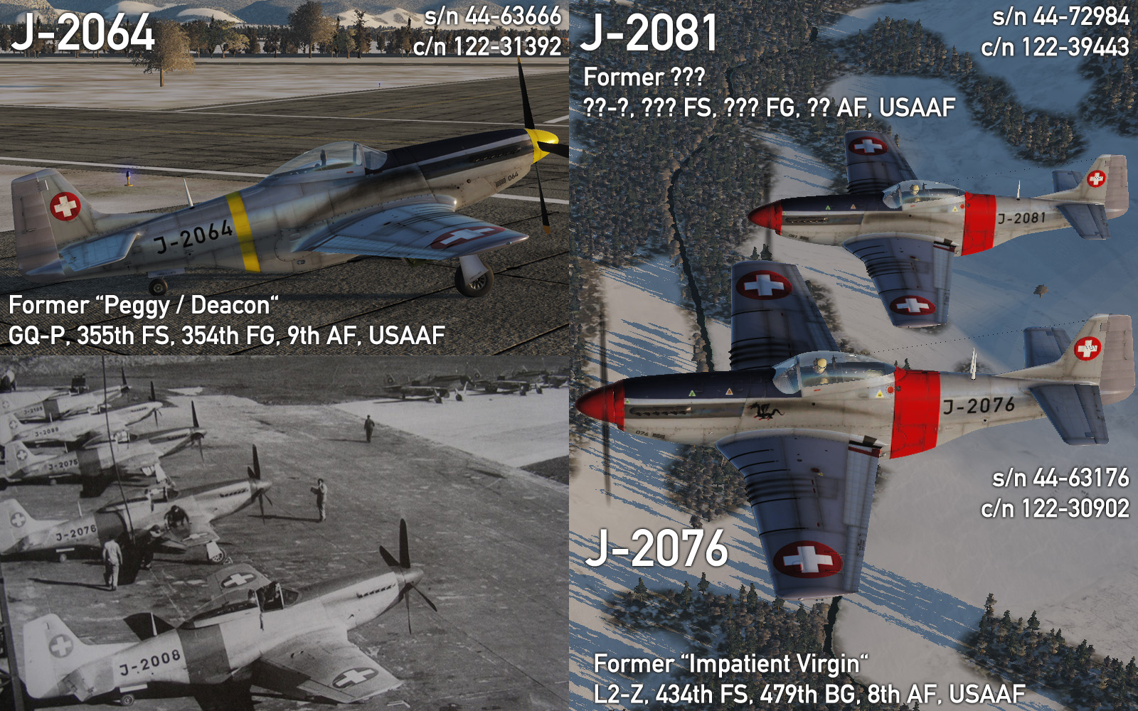 This pack contains 4 skins of the Mustang while in service with the Swiss Air Force. The skins are available for the P-51D-25-NA, P-51D-30-NA and TF-51D together.
