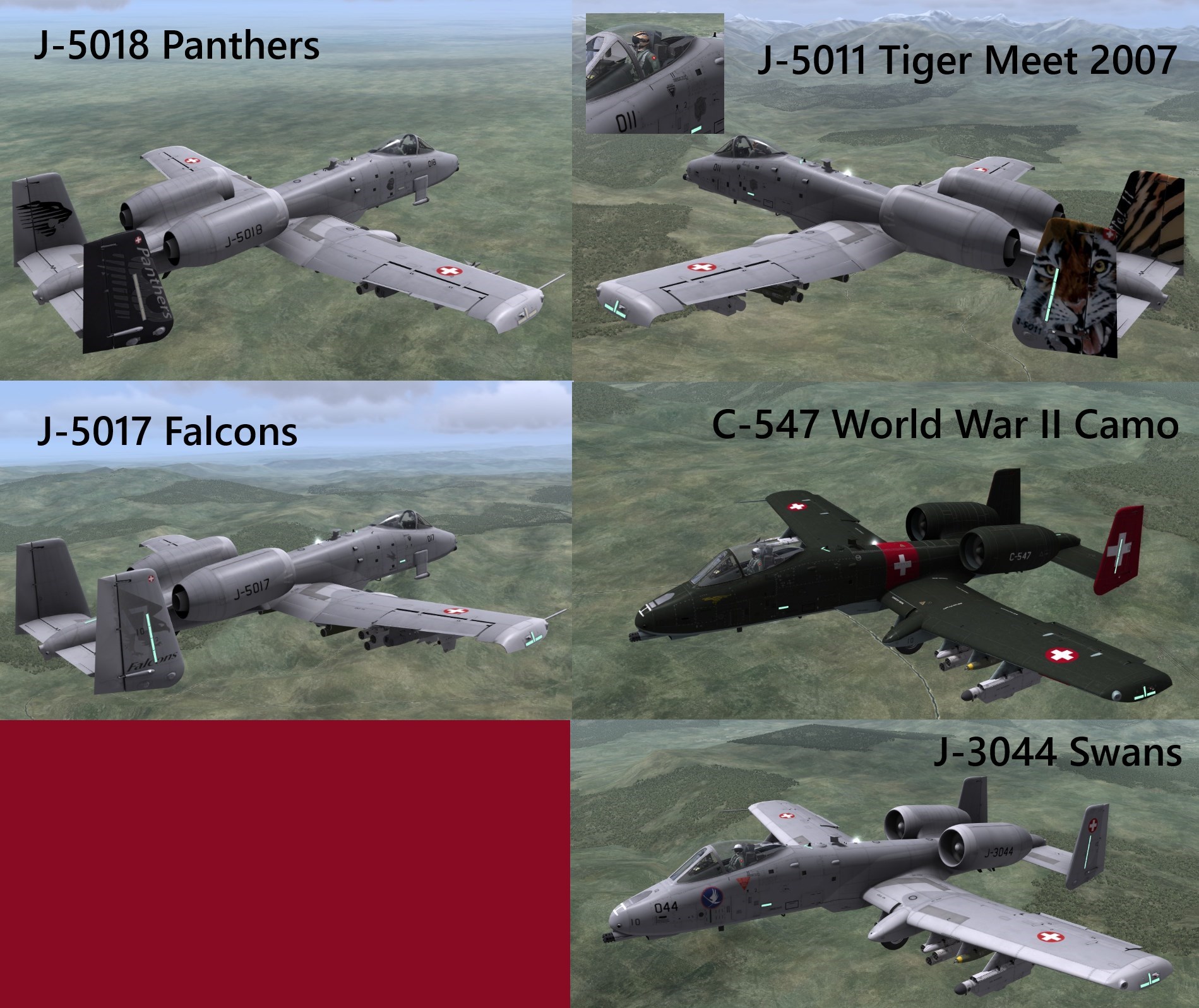 The pack contains 5 fictional A-10A & A-10C skins based on real Swiss Air Force planes.