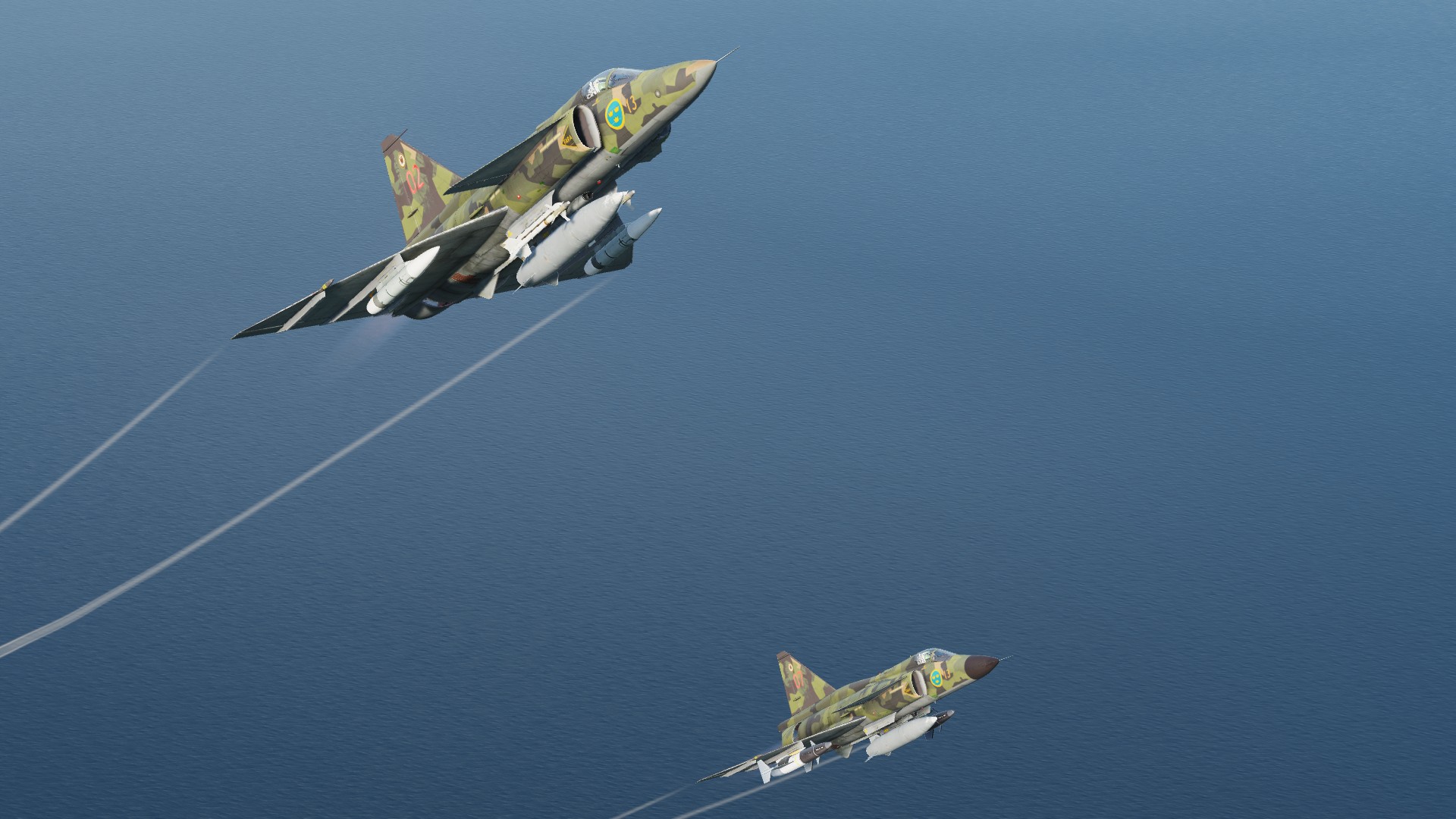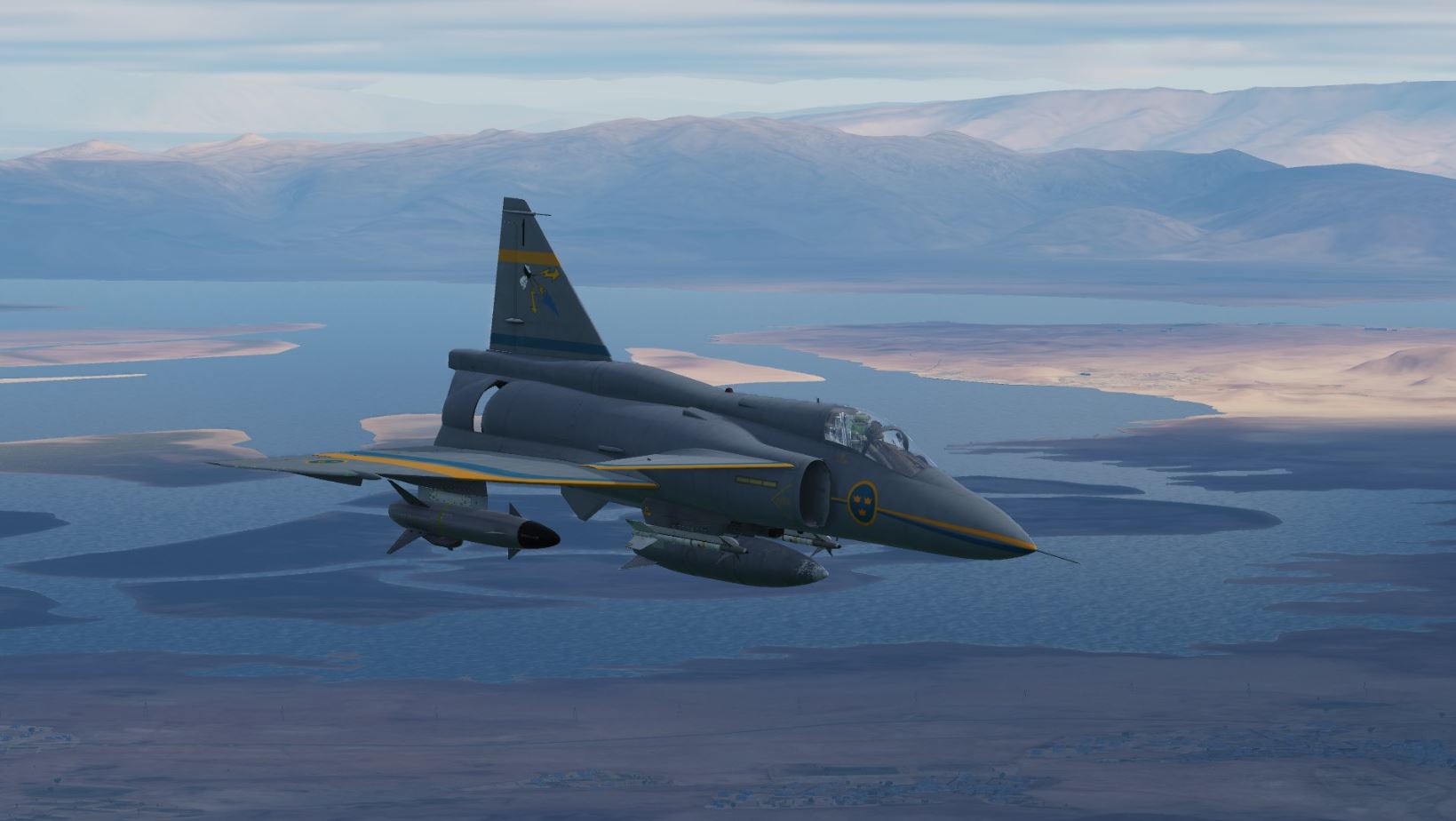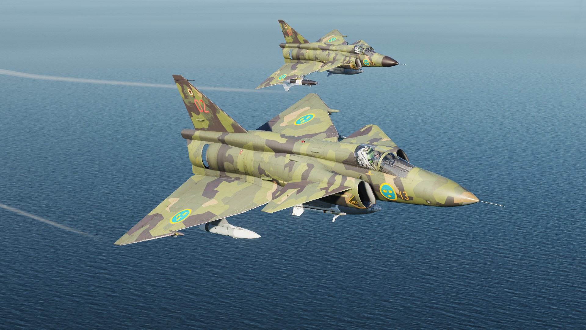 Armament-wise, they both could carry countermeasure pods and sidewinders on the 4 innermost pylons for self defense. The SH37 had a secondary role as a maritime strike aircraft and could carry 2 RB04's. In the 1990's these were upgraded to AJSH and AJSF, respectively, and became functionally the same (with some differences remaining) as the AJS37 we have in-game, though the AJSF never recieved any air to ground capability due to not having a radar.