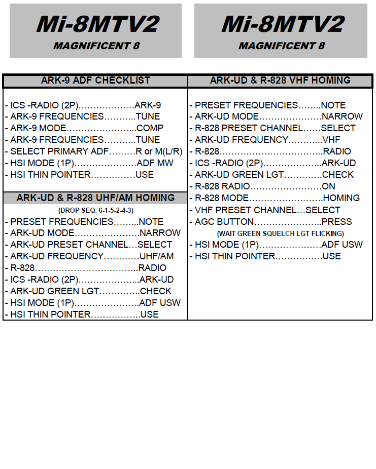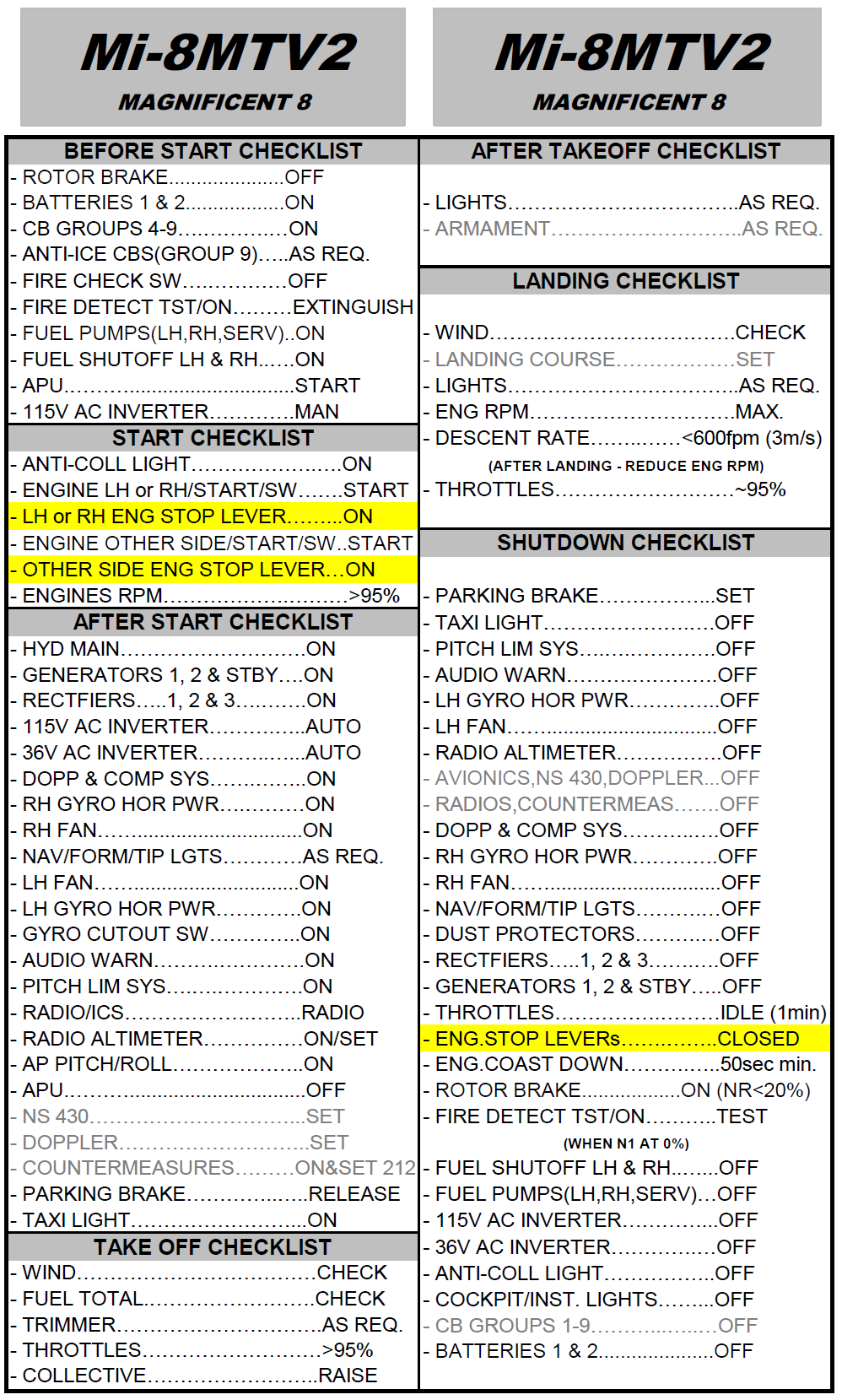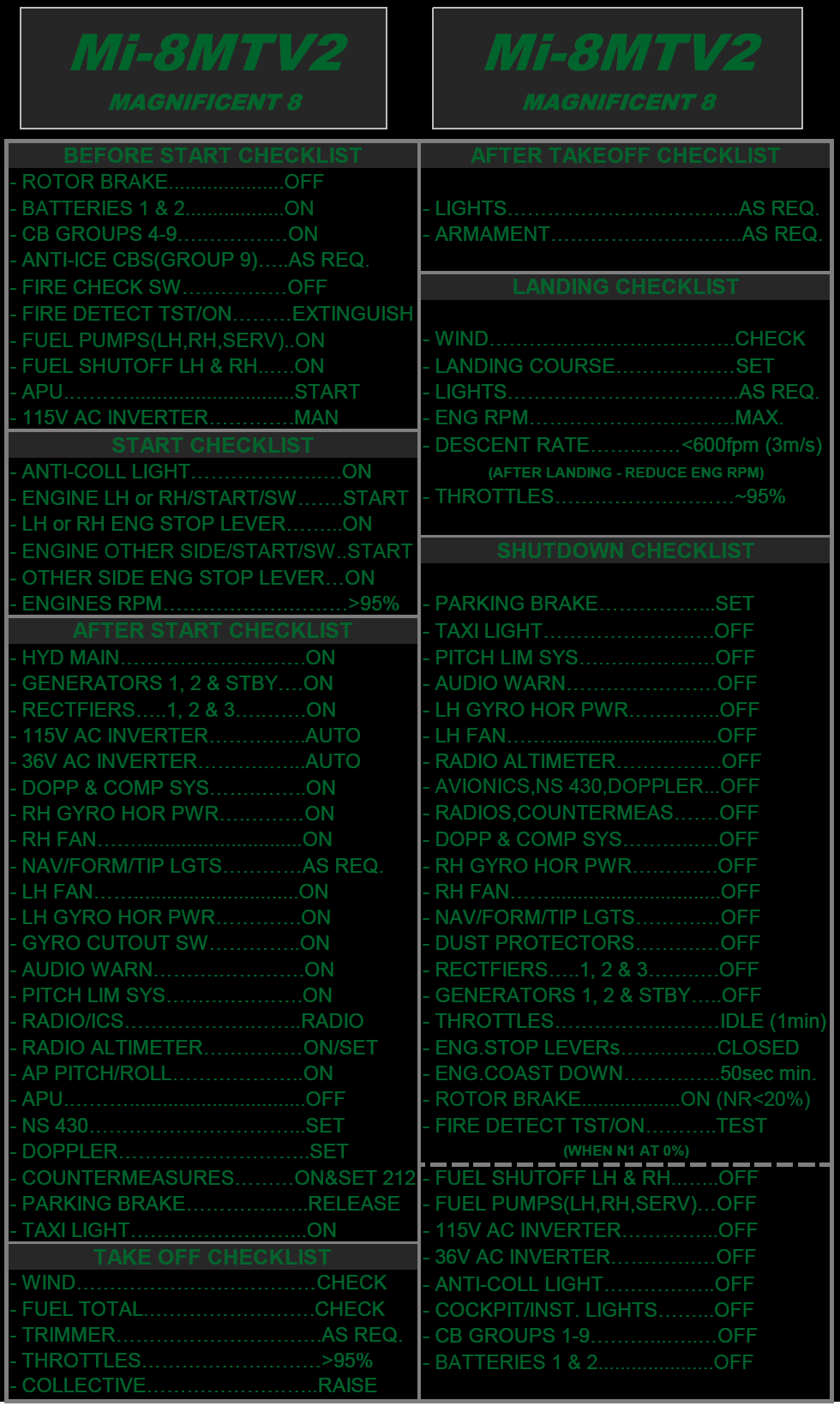 This is a checklist far from the real one, but that will get you flying quick and safely. Use at your discretion. (vs 1.1 - Updated BEFORE START, AFTER START, TAKE OFF, LANDING and SHUTDOWN Checklists. Introduced a Navigation Checklist)