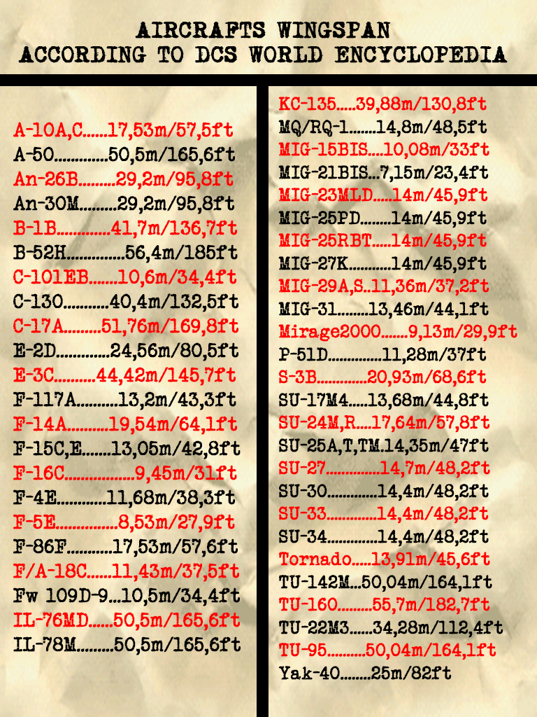 Aircrafts Wingspan According to DCS Encyclopedia.