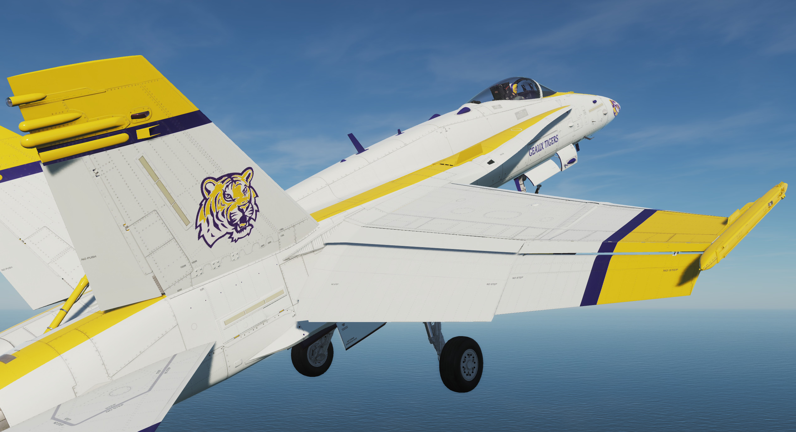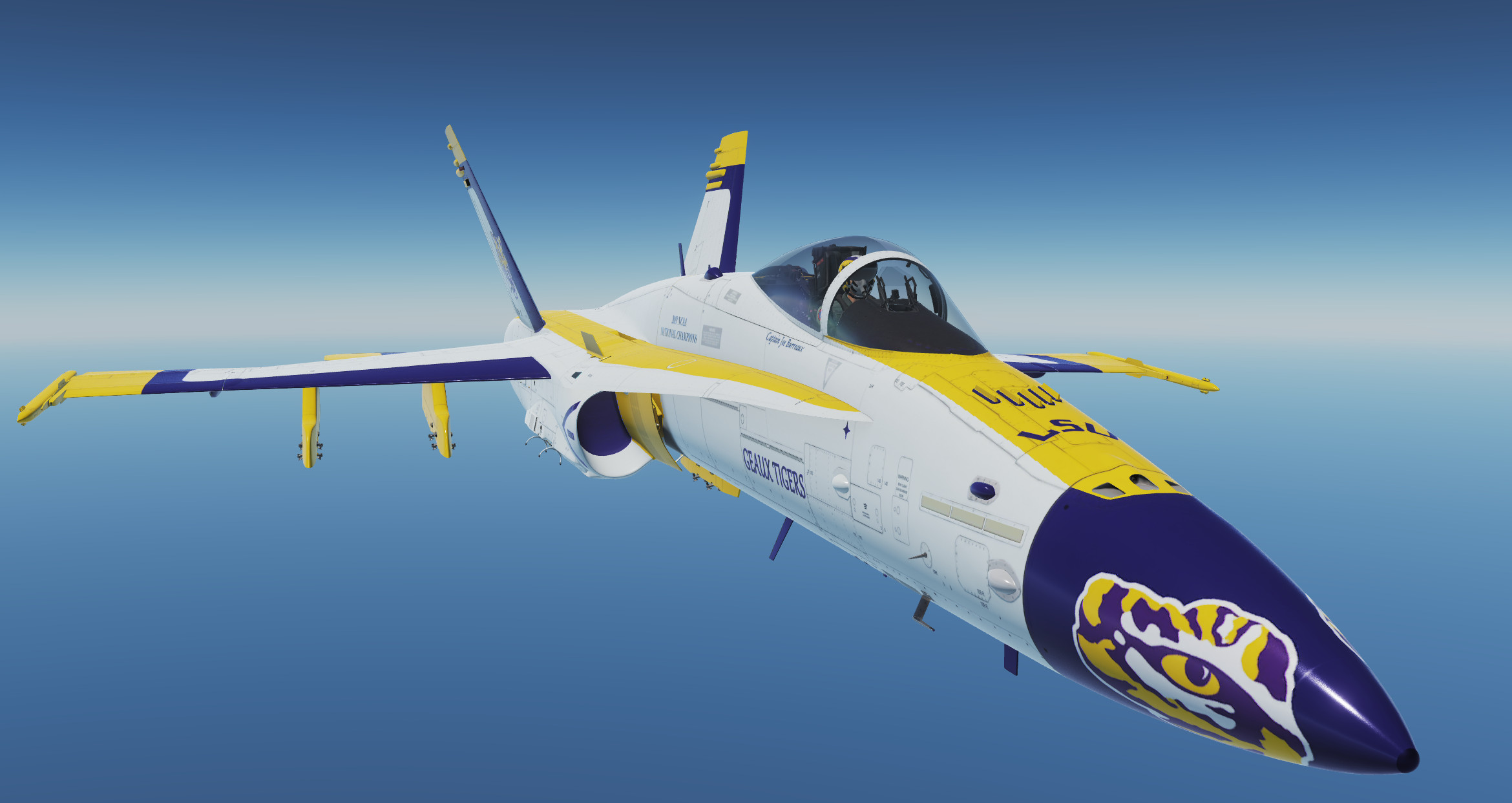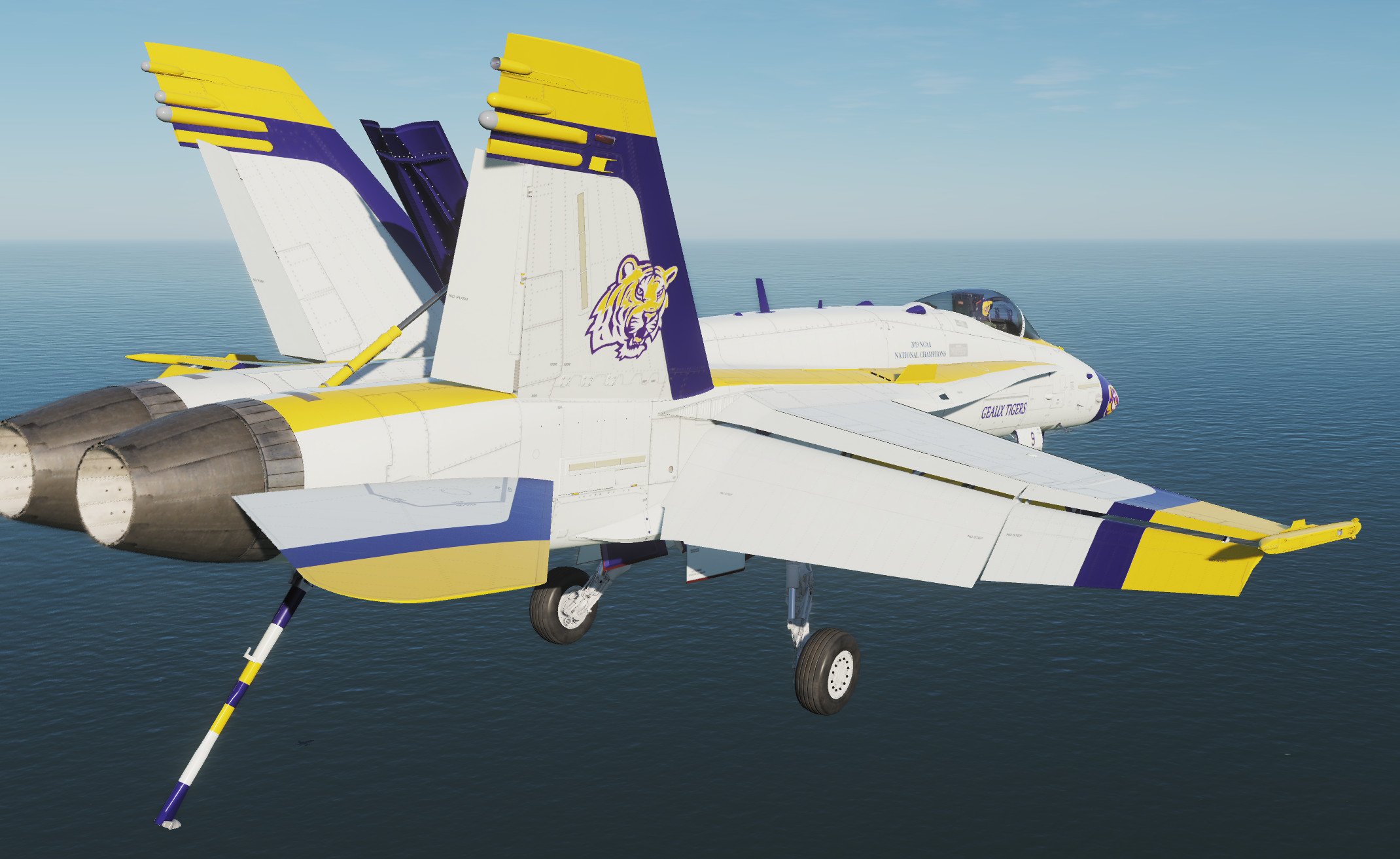 This Hornet skin is based on the uniform, logo and field of the LSU (Louisiana State University) 2019 National Champion college football team.  Included are both a clean airshow and dirty combat version of the paint scheme.   I've also created a new and improved version for the Hornet you can find by searching for "LSU Tiger Hornet Championship Edition" (it has a different paint scheme name in mission editor so both versions can coexist) and an Su33 version based on their alternate purple jerseys, you can find that one by searching for "LSU Tiger Su33".
