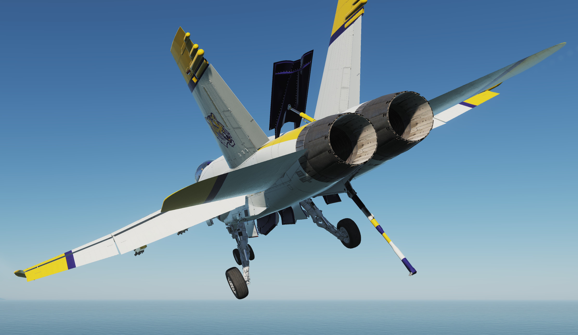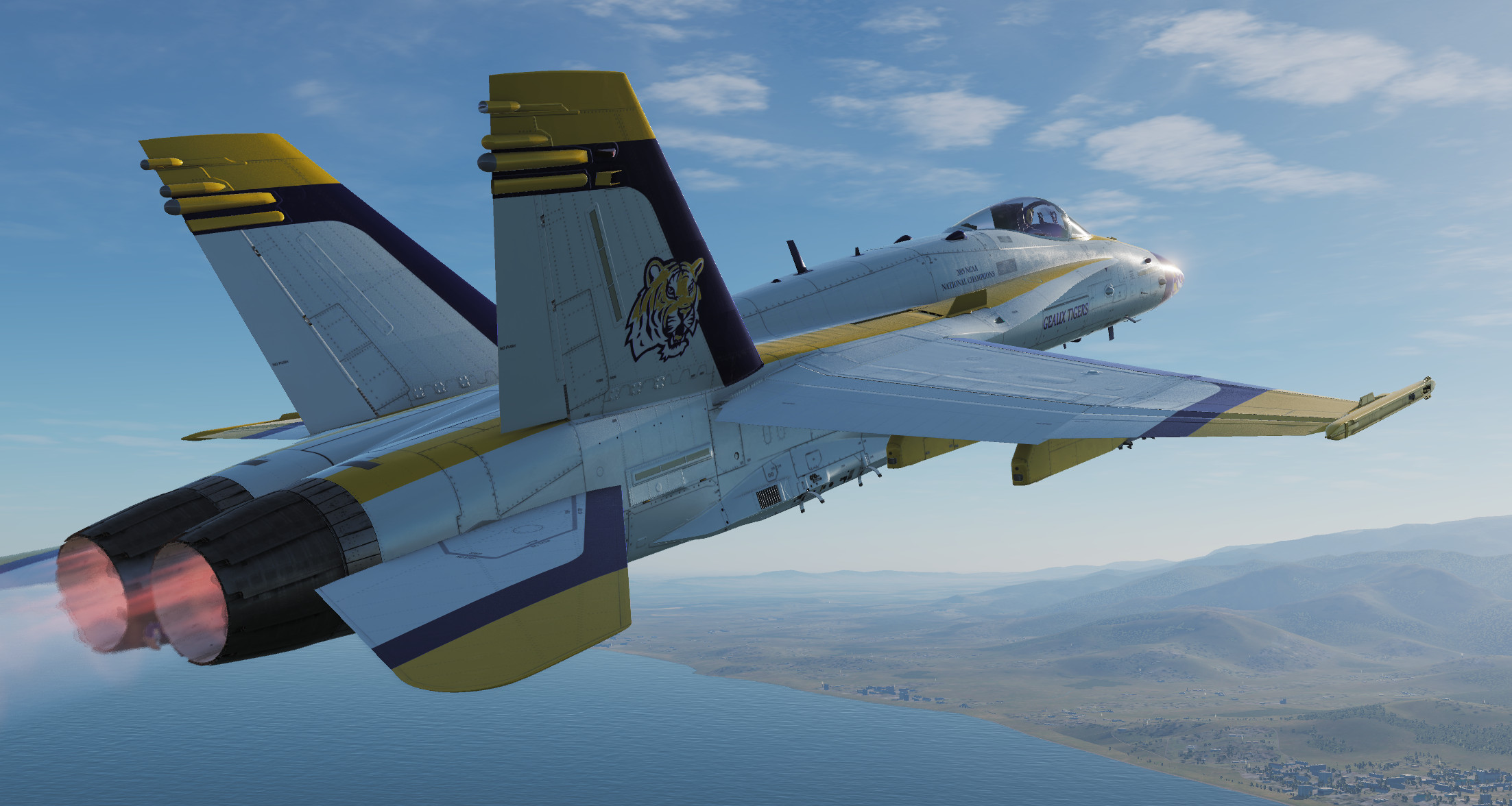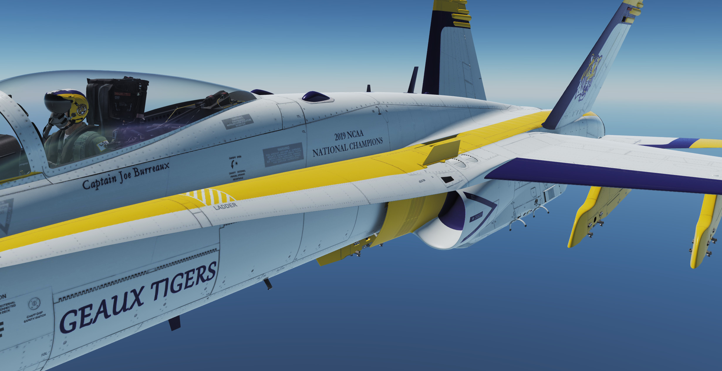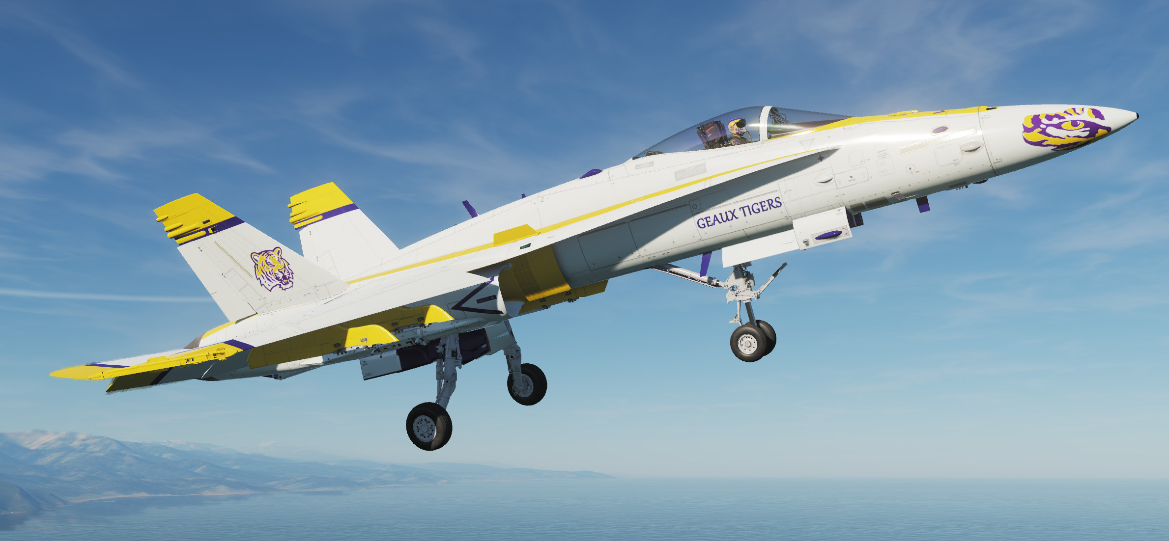 This Hornet skin is based on the uniform, logo and field of the LSU (Louisiana State University) 2019 National Champion college football team.  Included are both a clean airshow and dirty combat version of the paint scheme.   I've also created a new and improved version for the Hornet you can find by searching for "LSU Tiger Hornet Championship Edition" (it has a different paint scheme name in mission editor so both versions can coexist) and an Su33 version based on their alternate purple jerseys, you can find that one by searching for "LSU Tiger Su33".