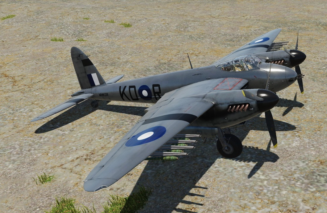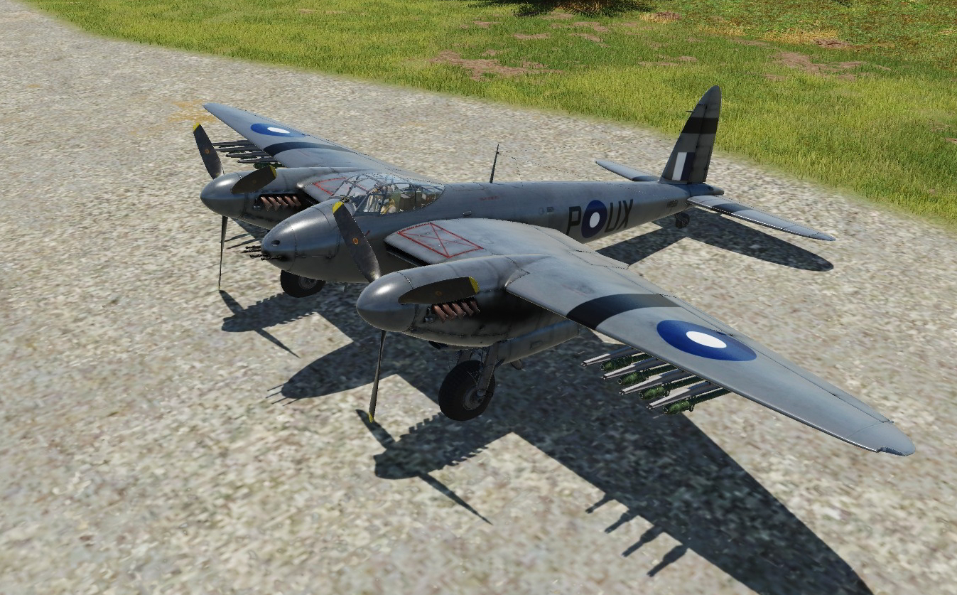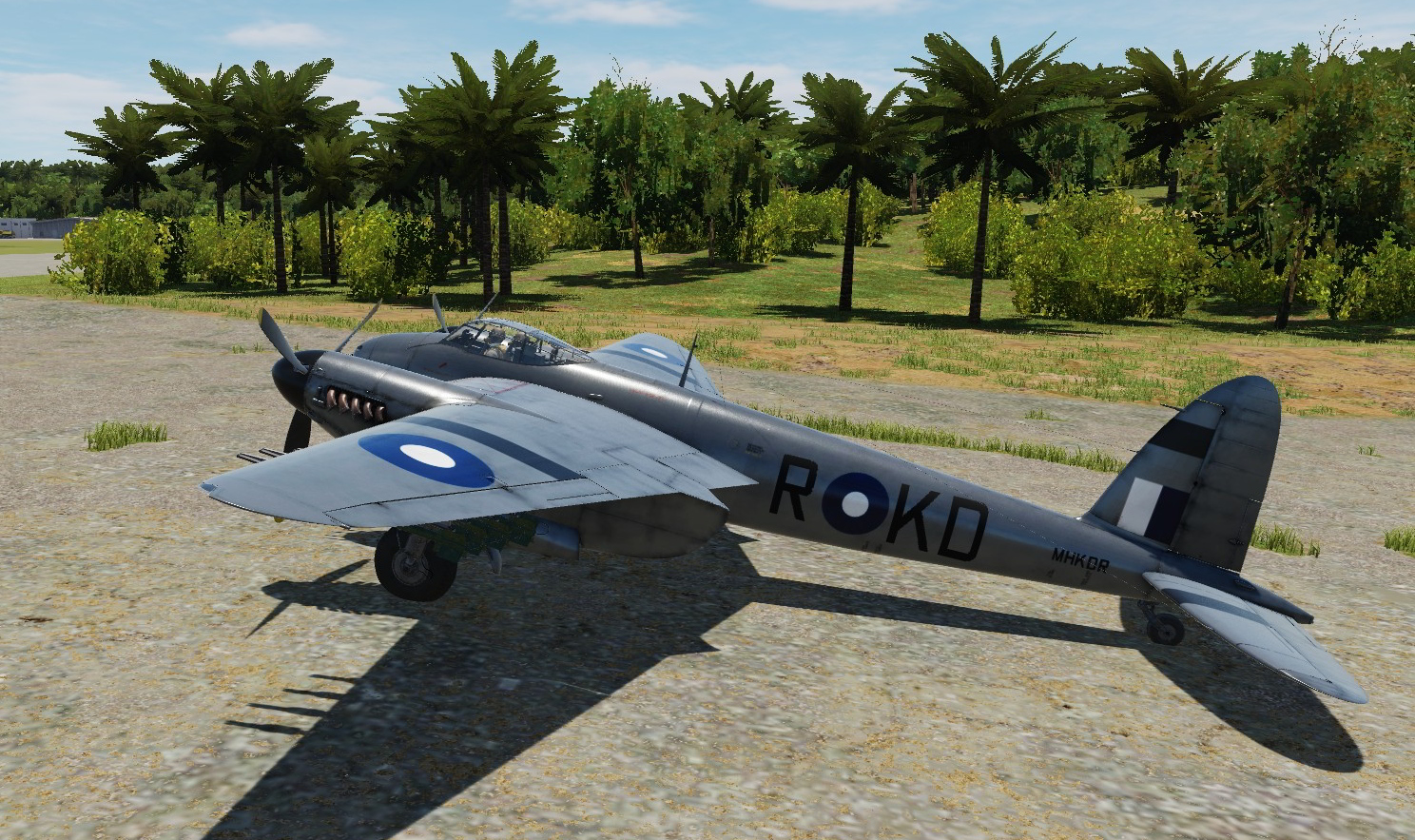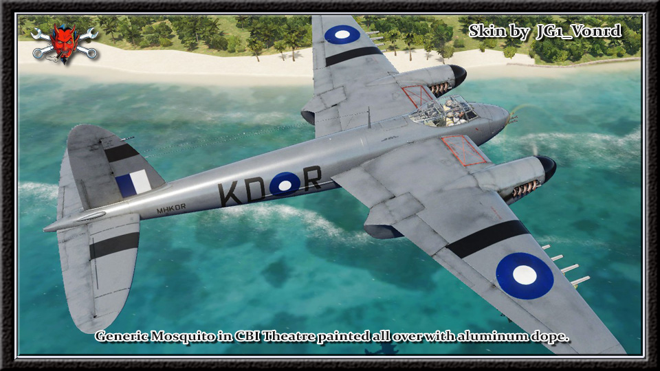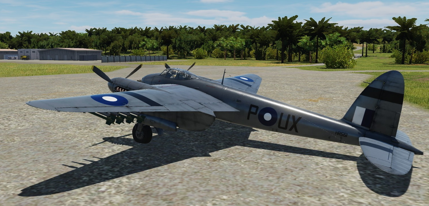 The camouflaged version of Flight Lieutenant A Torrance of 'A' Flight, No. 27 Squadron, RAF Mosquito at Parashuram, India, for a sortie over Burma, March 30, 1944. With the kind assistance of "Busdriver" from the IL2 Sturmovik forum and "Helles Belle" from the DCS forum, it was determined that No. 27 Squadron didn't use any letter codes on their aircraft. Special thanks to "Raptorattacker", IL2 skinner supreme for his fuel spill image which I have used and modified. Added numerous weathering "eye candy" including muddy landing gear and ground crew handprints.