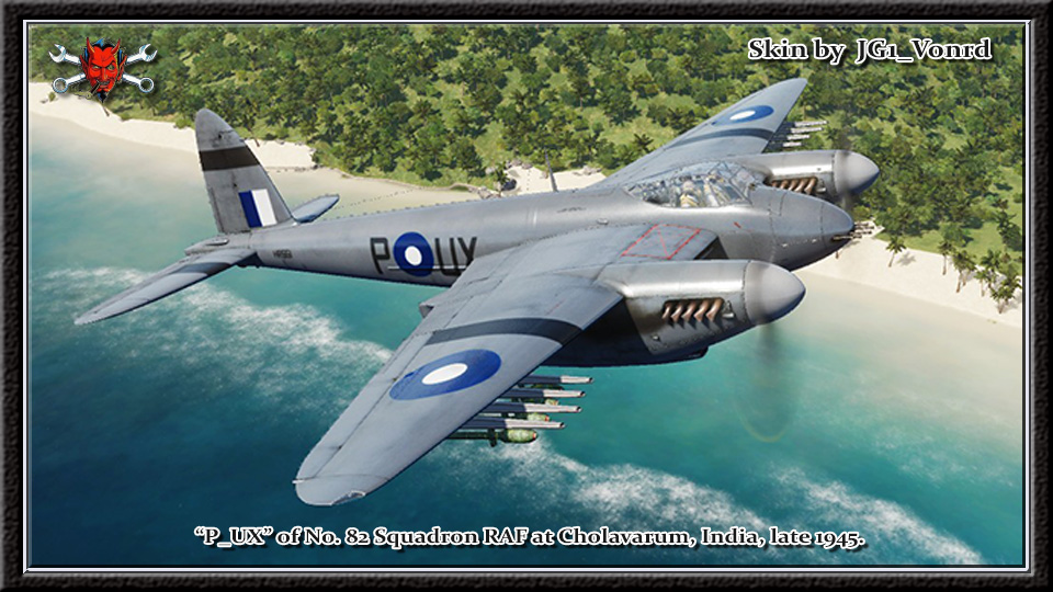 PoUX in 1945 in Cholavarum close to Madras in India. It wears SEAC two-tone blue markings over an all painted aluminium finish. No. 82 Squadron RAF had Squadron code "UX". The squadron left Bomber Command and relocated to RAF Cholavarum, India in early 1942. The squadron was re-equipped with Mosquitoes in July 1944, but was temporarily grounded due to failures in the wooden structure before commencing ground attack sorties on 19 December. These operations continued until 12 May 1945, when the squadron was withdrawn to India to prepare for the proposed invasion of Malaya. This operation did not occur due to the end of the war, and the squadron was disbanded on 15 March 1946. Problems were found with glue adhesion in the humidity, but it was actually the tropical heat that was the more immediate problem; the Australians did some experiments and found that painting the Mosquito silver reduced the heat inside the wings by a significant amount (appx. by 15 degrees during the daytime).