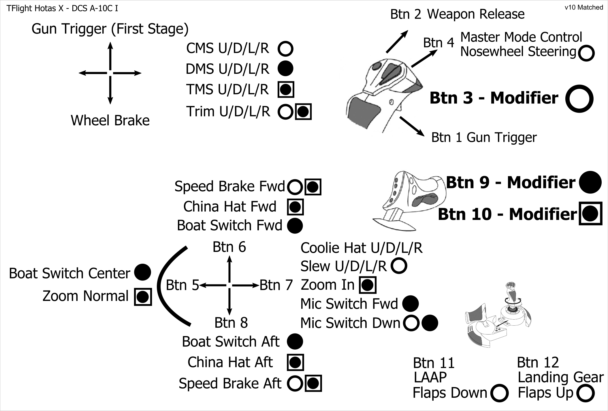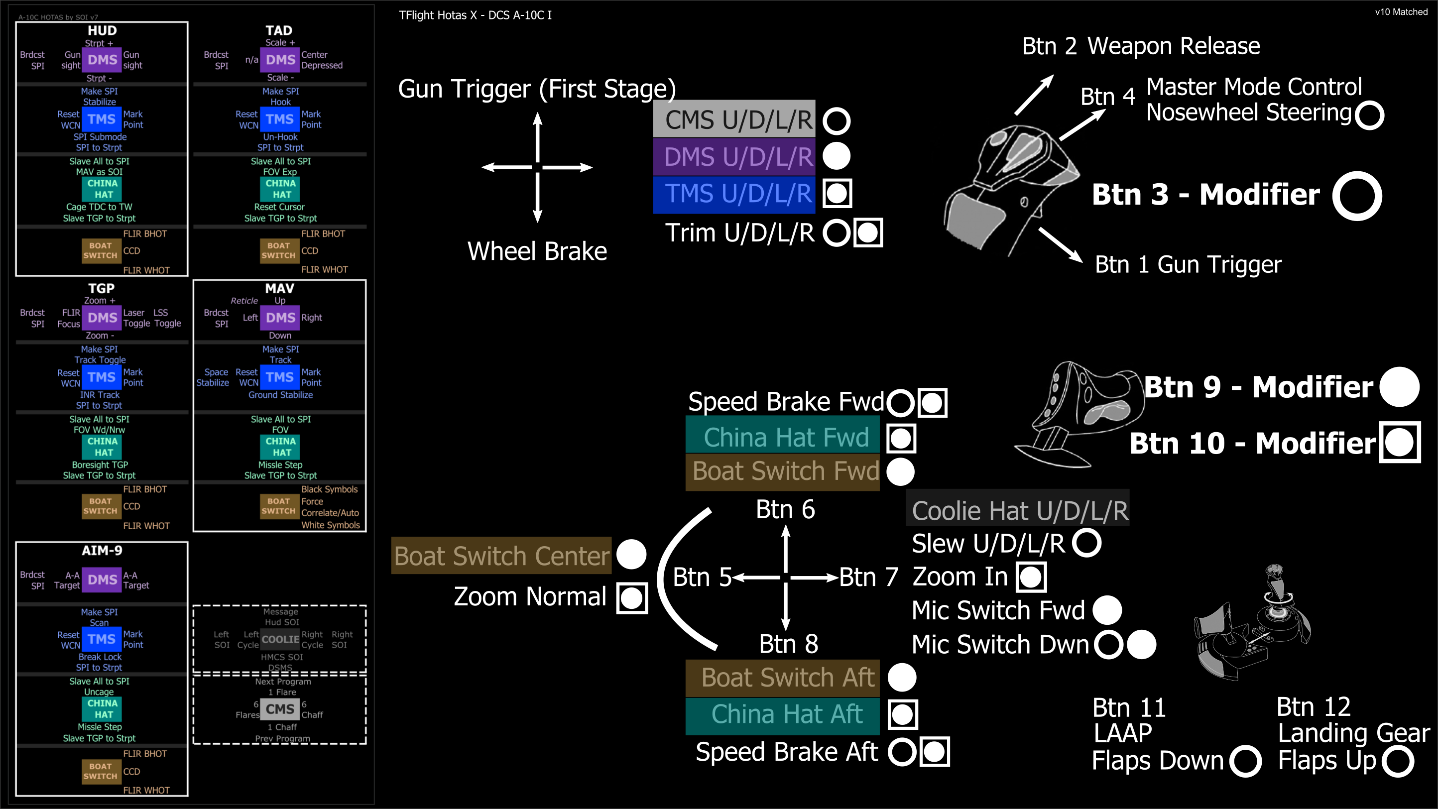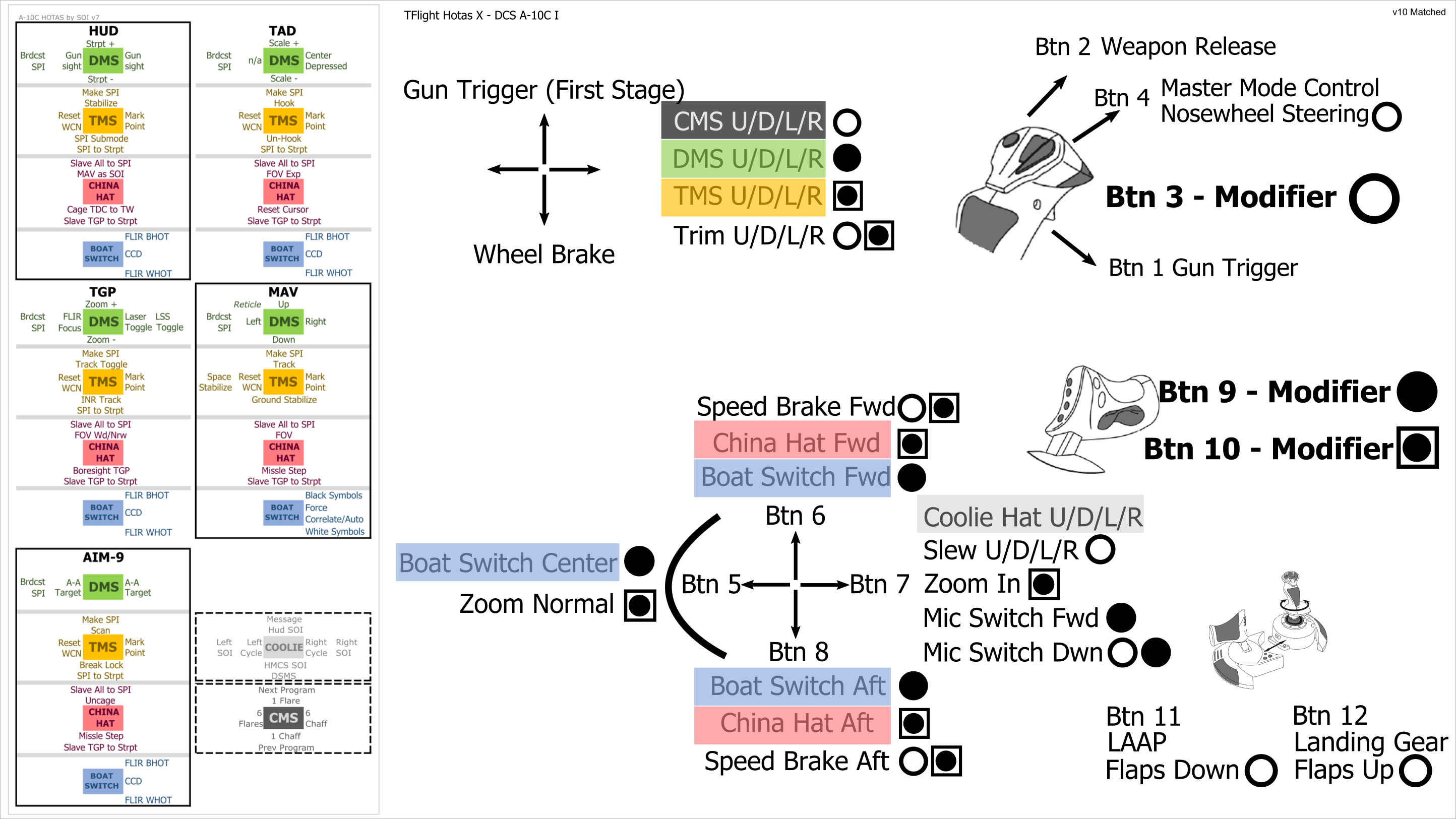 Control profile for the Thrustmaster Tflight HOTAS X joystick in DCS A-10C with attached diagrams for easy reference, including bonus HOTAS by SOI references.