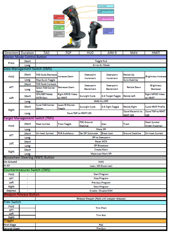 Picture and charts of the HOTAS controls for the A10C 2 Tank Hunter