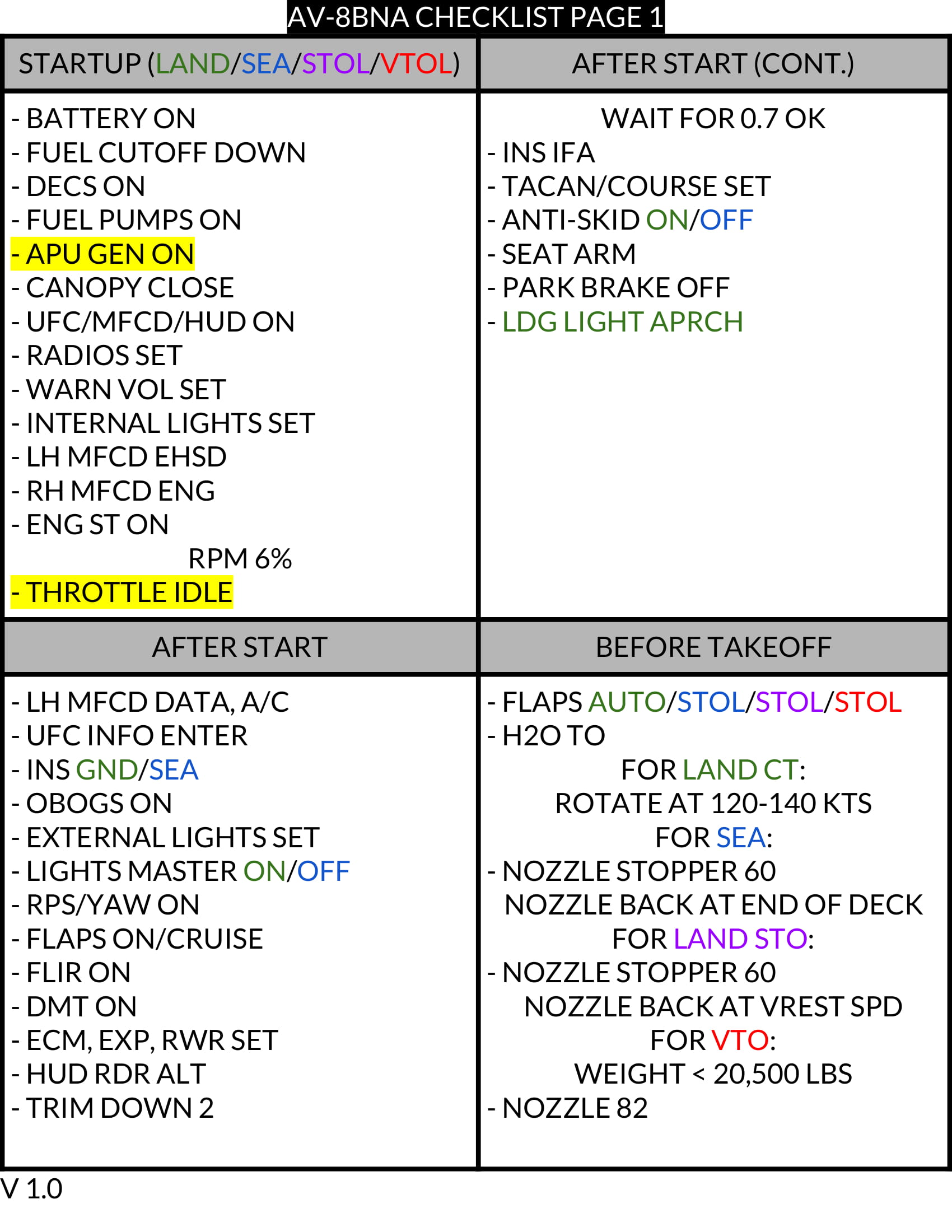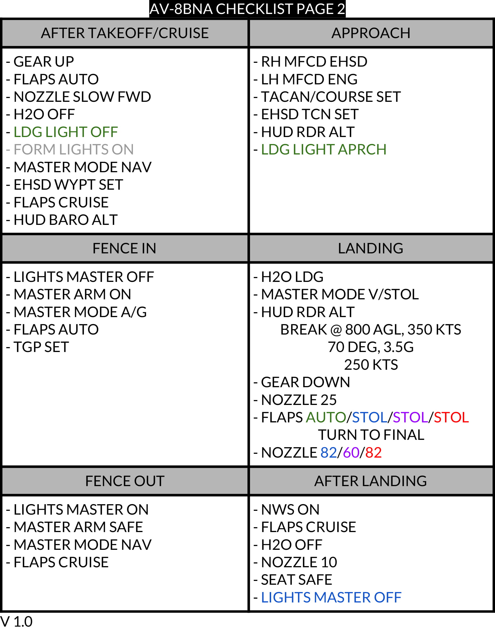 This is an enhanced checklist for the AV-8BNA Harrier II. It includes optimized startup, takeoff, cruise, fence in/out, refueling, approach, and landing checklists.