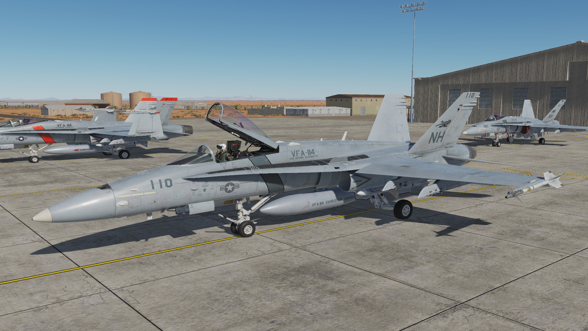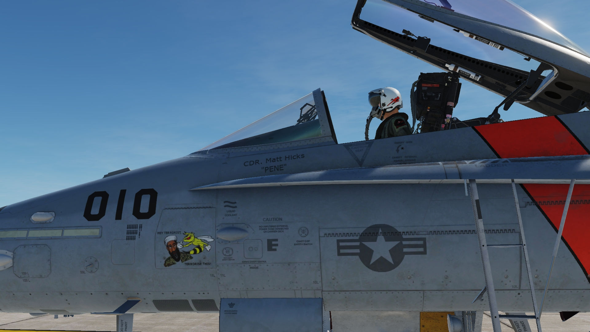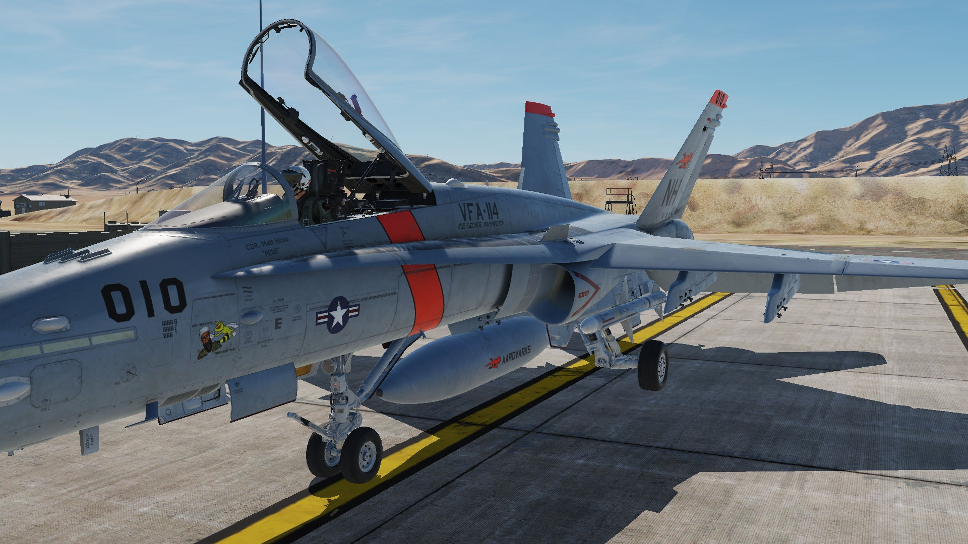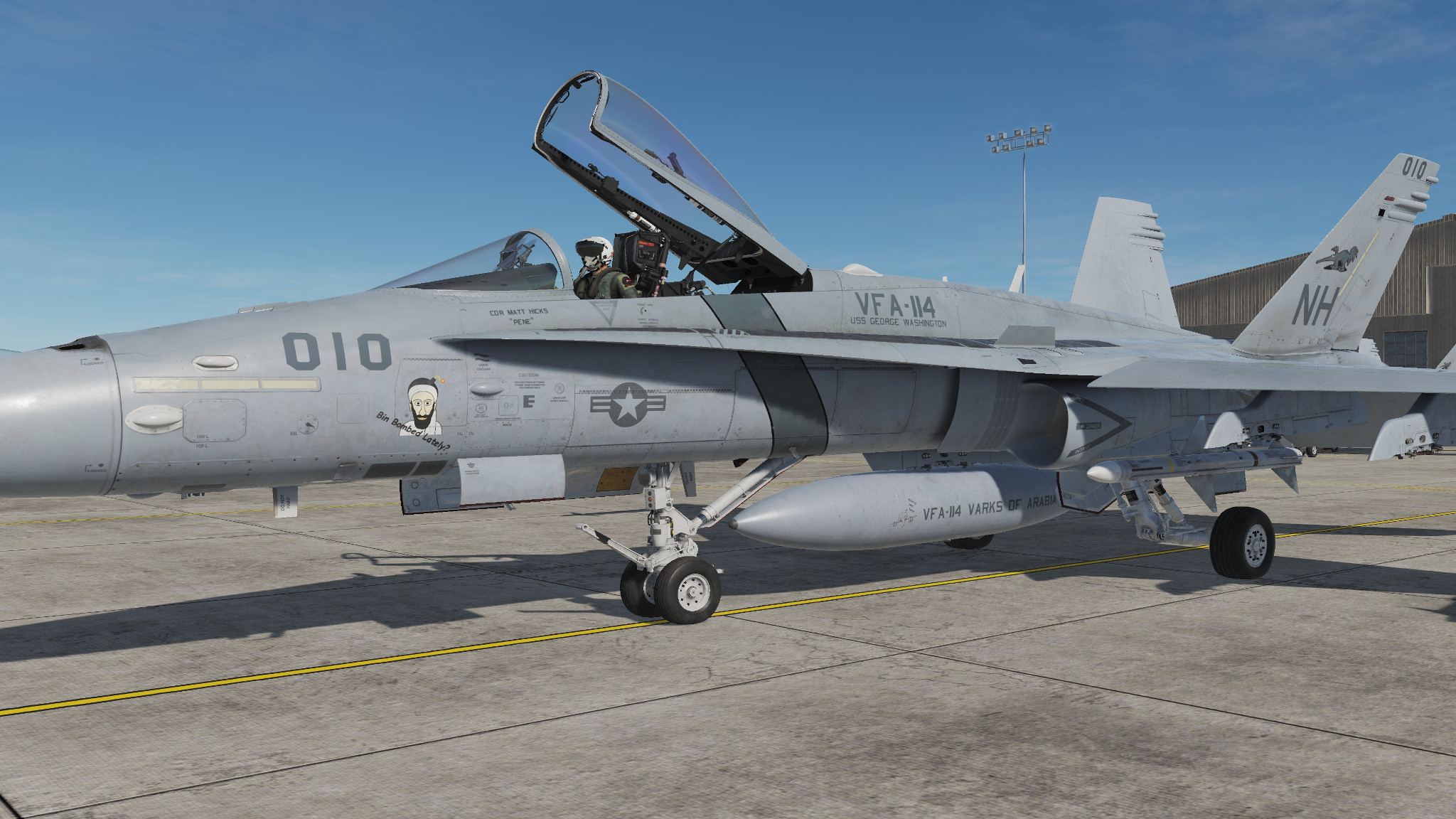 VFA-114 LowViz Livery for the DCS F/A-18 Block 20. CDR Matt Hicks with "Bin Bombed Lately" Nose Art. What could have been after VF-114 retired it's Tomcats in 1993. Unfortunately the Squadron was disestablished due to the post Cold War budget cuts to Naval Aviation.