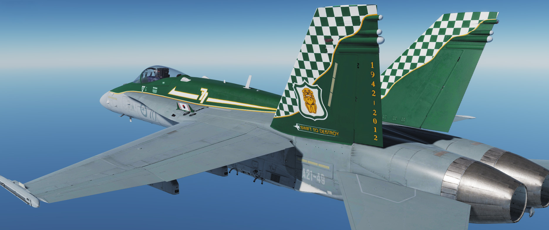 A21-49 appears as it did between January 2012 and February 2013, where it featured at the Australian International Airshow at Avalon in Victoria. In 2011, members from No. 77 SQN were asked to come up with a design to be painted on a Hornet to coincide with the Squadrons 70th Anniversary celebrations. The scheme was designed by 77 SQN personnel, LAC Nicholas Pearsall, CPL Aaron Somerville and SGT Chris Henderson.