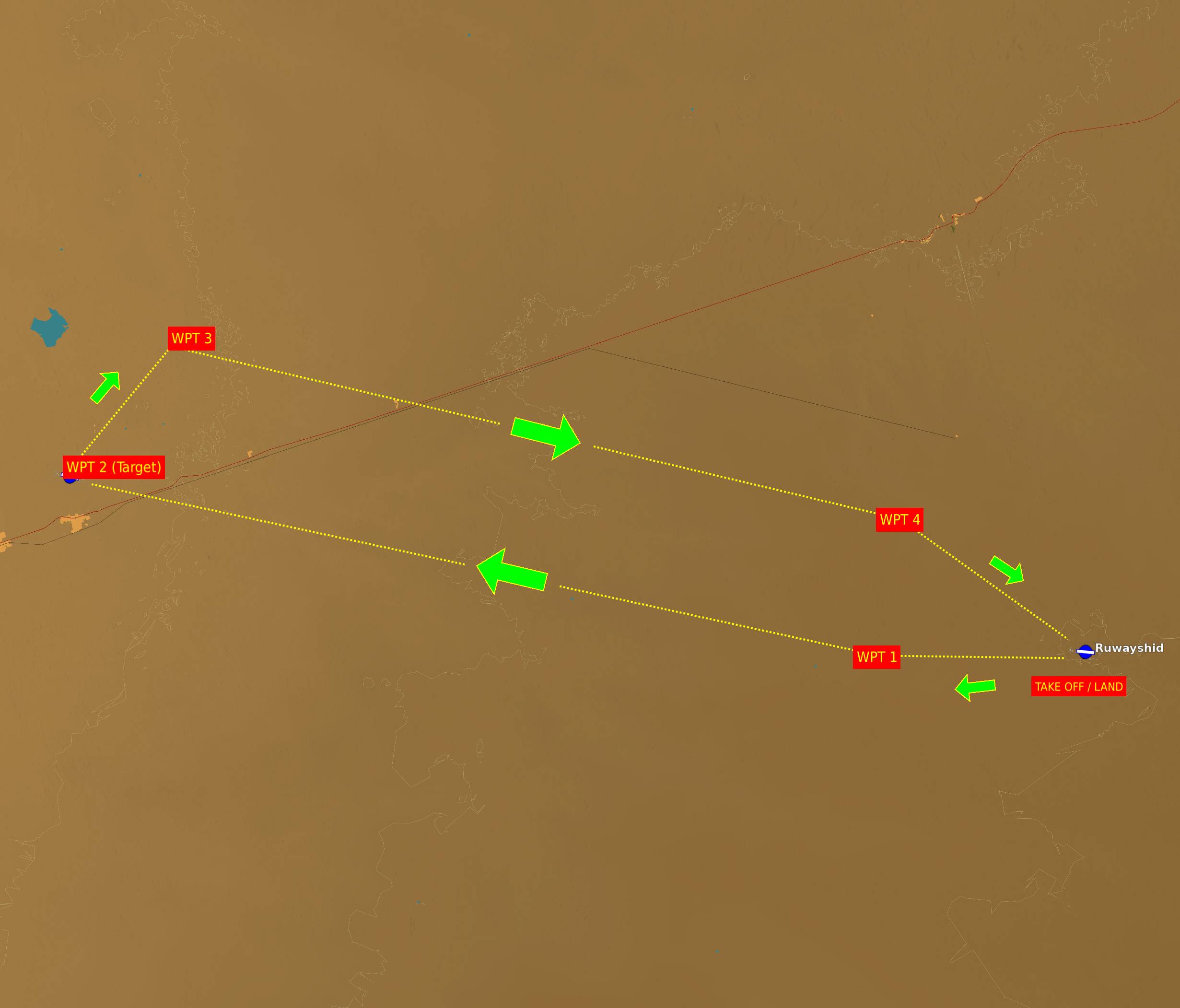 You have recently graduated and have been assigned to an Iraqi Air Force Mirage F-1CE squadron that has been deployed to Ruwayshid Air Base due to recent tensions between Iraq and Jordan. Today you will be the wingman of the flight "Ramadan" in a war OCA mission consisting of two Mirage F-1 (one two-seater F-1 BQ (lider) and one one-seater F-1CE (player)) to disable the H4 air base runway using Durandal bombs. You must follow your leader at all times and fly at low altitude to avoid detection by enemy radars since we are going to fly in Jordan's airspace. You must tune in to the frequency of your flight (127.5 MHz) as soon as you start the plane and communicate with your leader. The exercise will be completed when you pass over all the waypoints (waypoints), drop your bombs and land safely. Note: Use COMMS MENU -> F10 to interact with your leader (Do not use ATC COMMS).