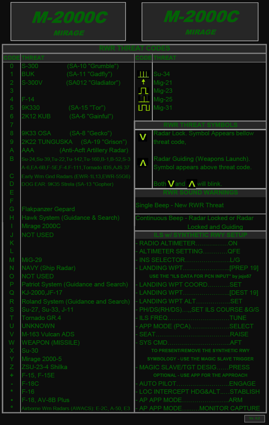 This is my attempt to create true-to-current DCS standarts RWR sheet for newbie players (or unexperienced, like me), because many RWR creators use DCS's rwr.lua file, which contains outdated codes, refers to emitters not presented in DCS nowadays, and so forth. I excluded many of them, checked all of them, added types-of-radar designation for ease of use and ranges of engagement and search, when emitter starts to pop-up on screen. Comment if you have any suggestions!