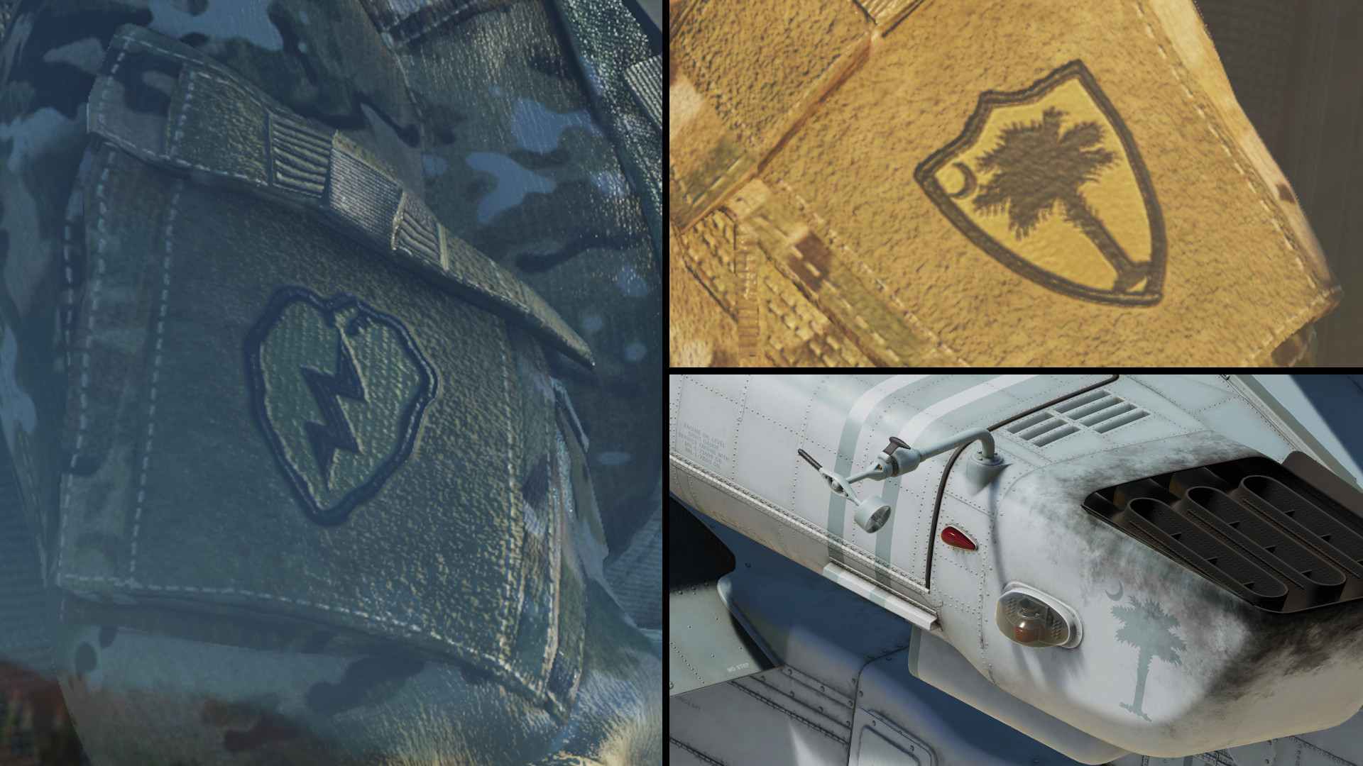 Contains 4 skins of Apaches from the South Carolina National Guard. Two are generic, with one having the nose match the overall scheme, while the other has olive drab on the nose as was frequently seen on gray Apaches. The other two are specific aircraft; 40331 and 40332 during 2004 in Iraq. Reflecting the fact that this unit operated in support of the 25th infantry division during that timeframe, the right arm patch is that for said division. The left patch is the South Carolina Army National Guard patch. Some tweaks needed to be made to the engines and sidepods due to the differences between the AH-64A and AH-64D, but it's mostly a 1 for 1 recreation.