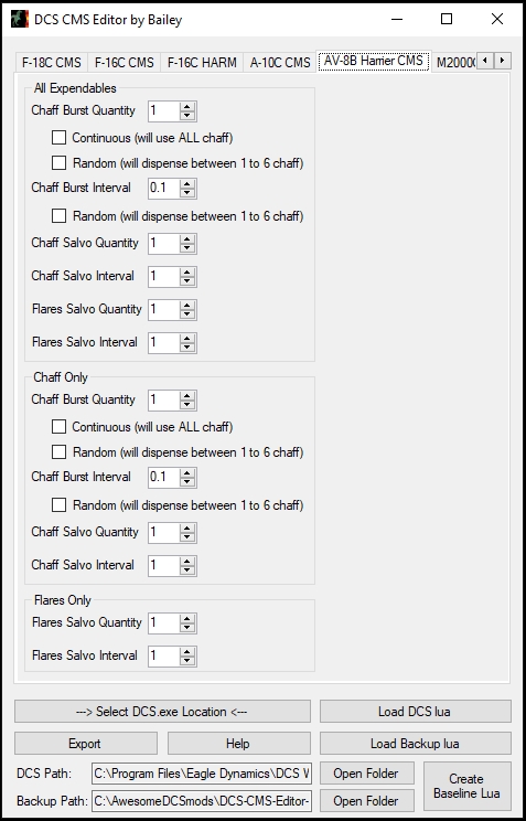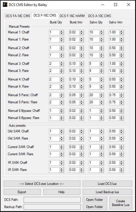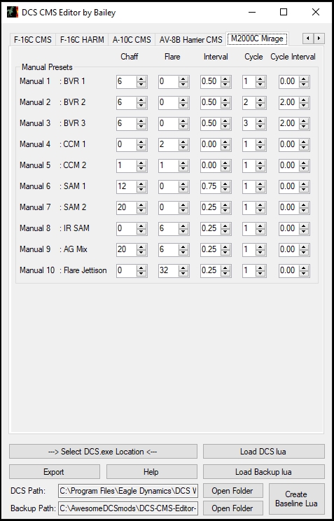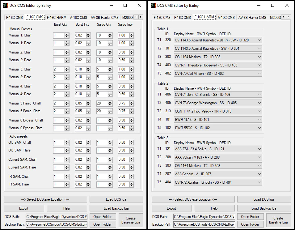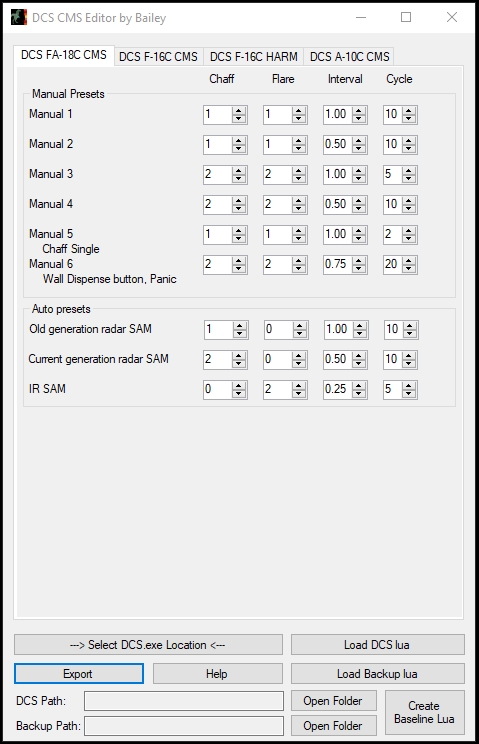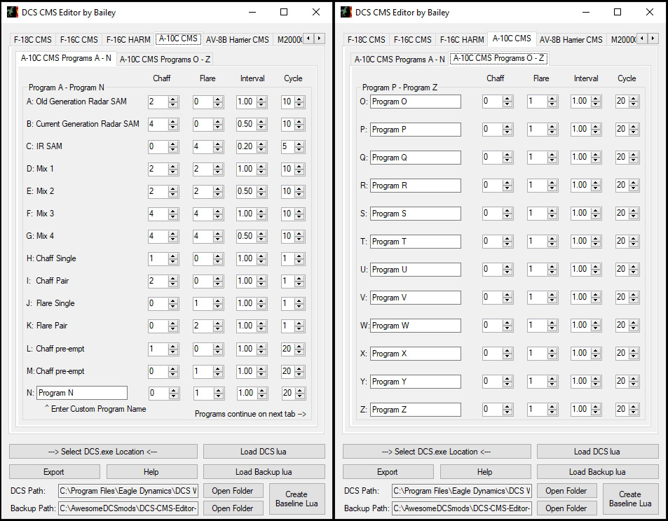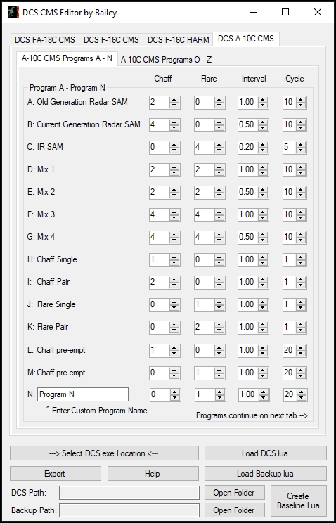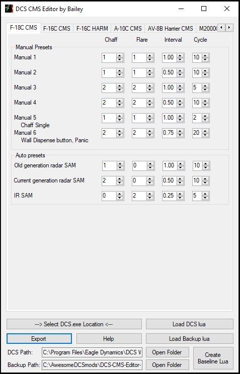 Have you ever wanted to easily program the CMDS countermeasure system? Are you tired of modifying .lua files by hand, only to have them overwritten every time DCS updates? Have you been waiting too long for ED's DTC functionality? If you said "Yes" to any of these, well do I have the Utility for you! Introducing the DCS CMS Editor by Bailey. A picture is worth a thousand flares, er, words. Now with Hornet, Viper, Warthog, Warthog 2, Harrier, and Baguette (Mirage) support!