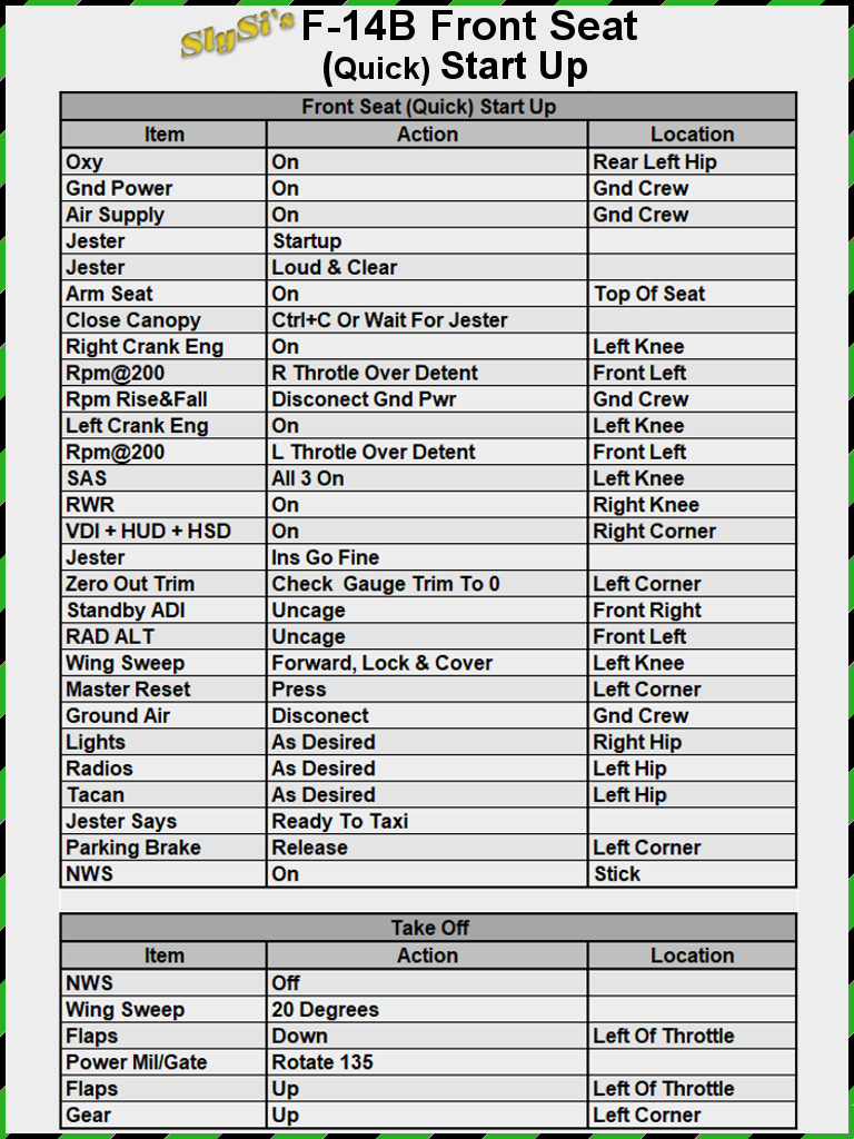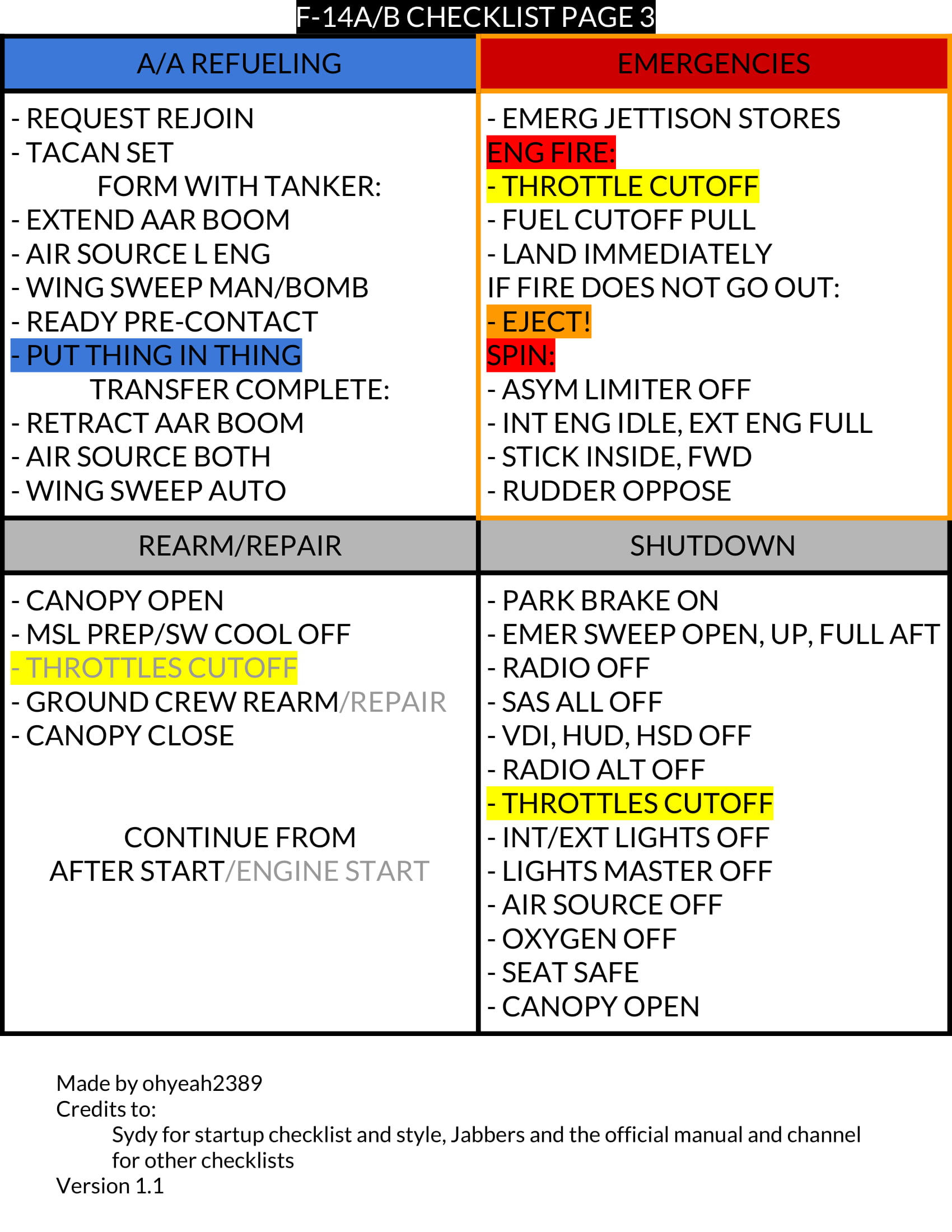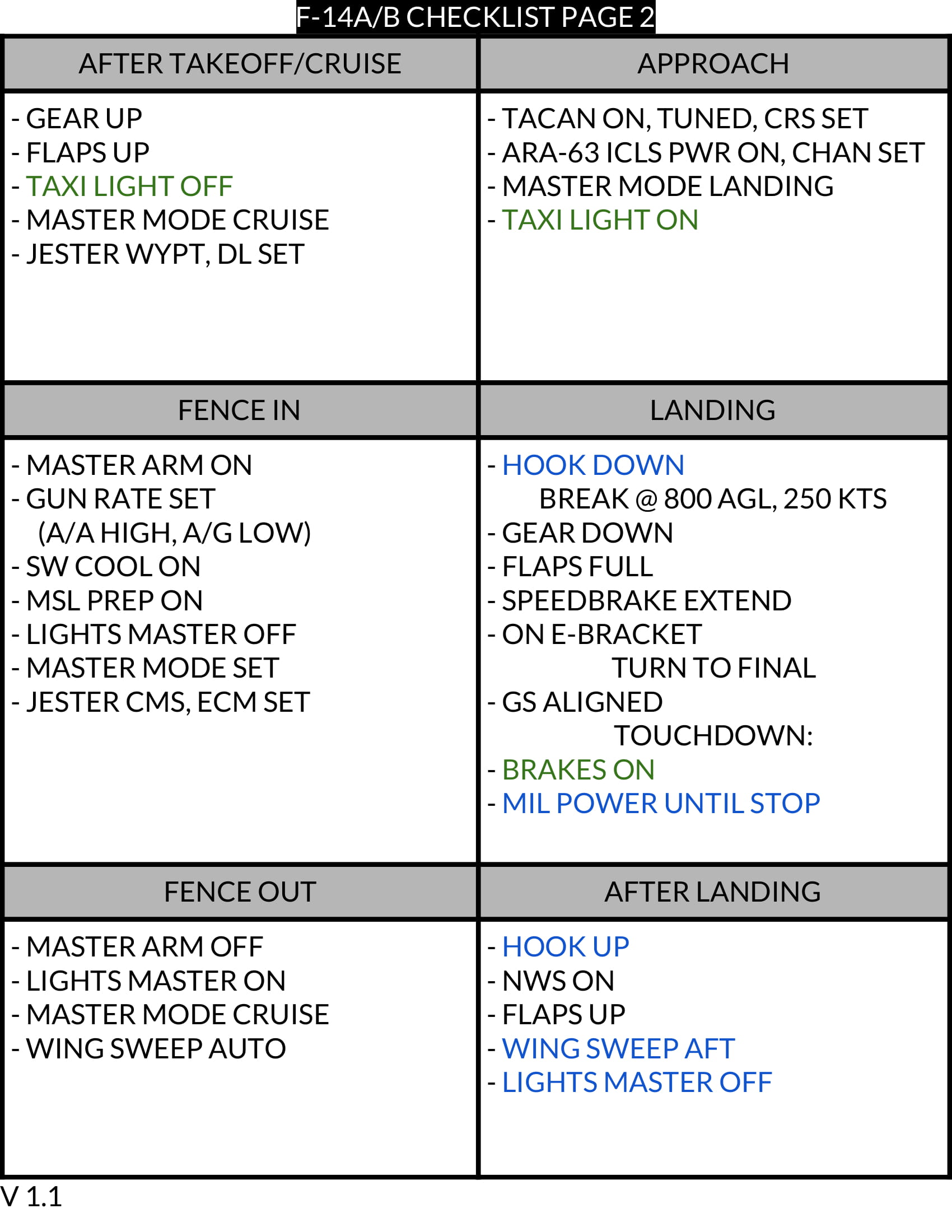 This is an enhanced checklist for the F-14B Tomcat. It includes optimized startup, takeoff, cruise, fence in/out, refueling, approach, and landing checklists.