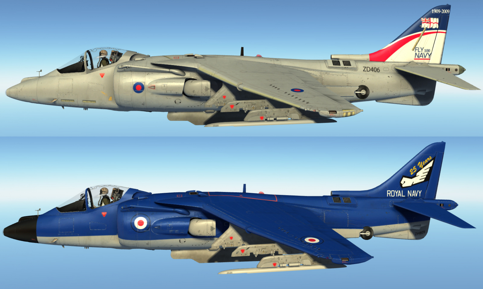 Two Royal Navy anniversary paint shemes; Gr.9 ZD406 and Sea Harrier ZH809 (a.k.a. The Admiral's Barge).