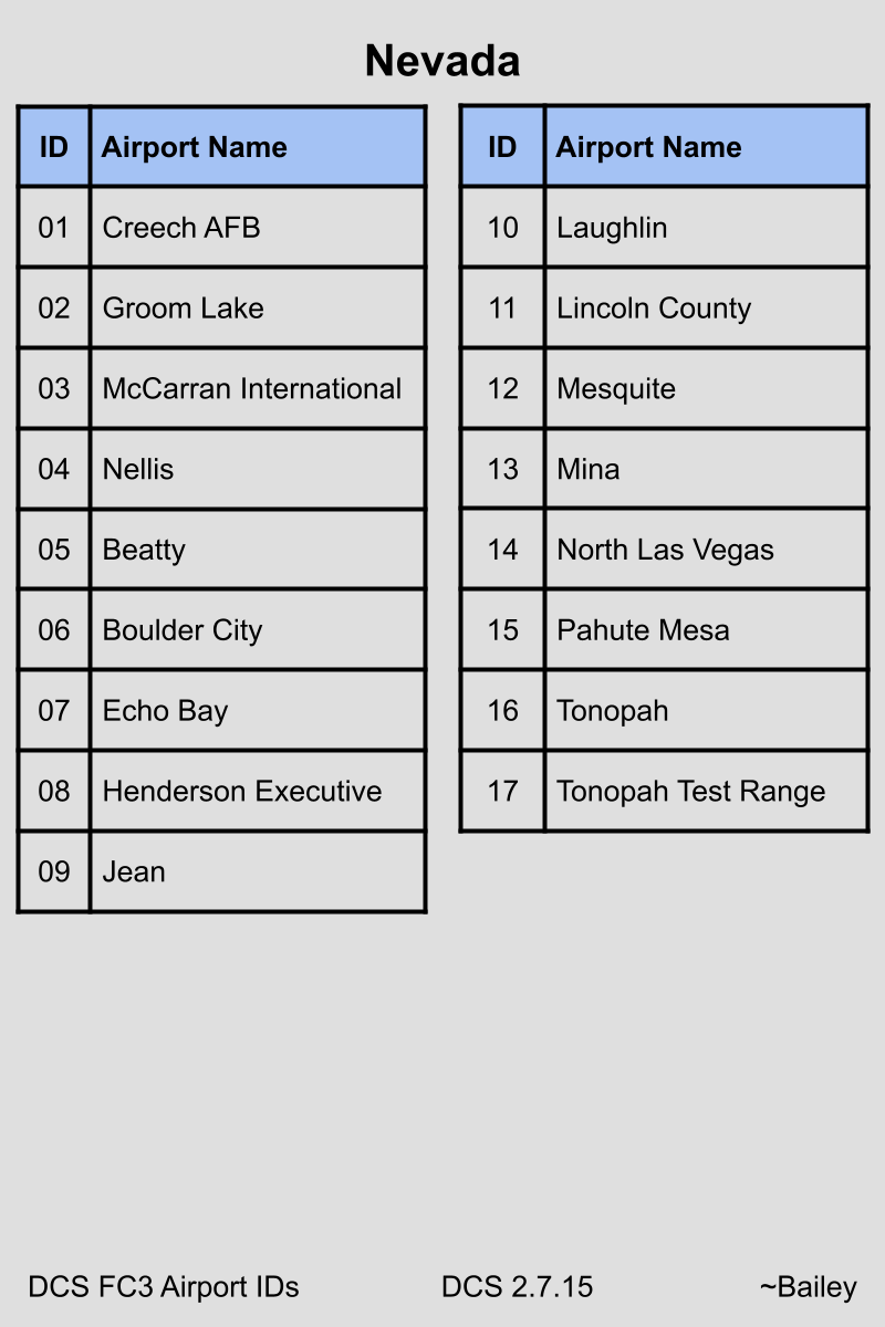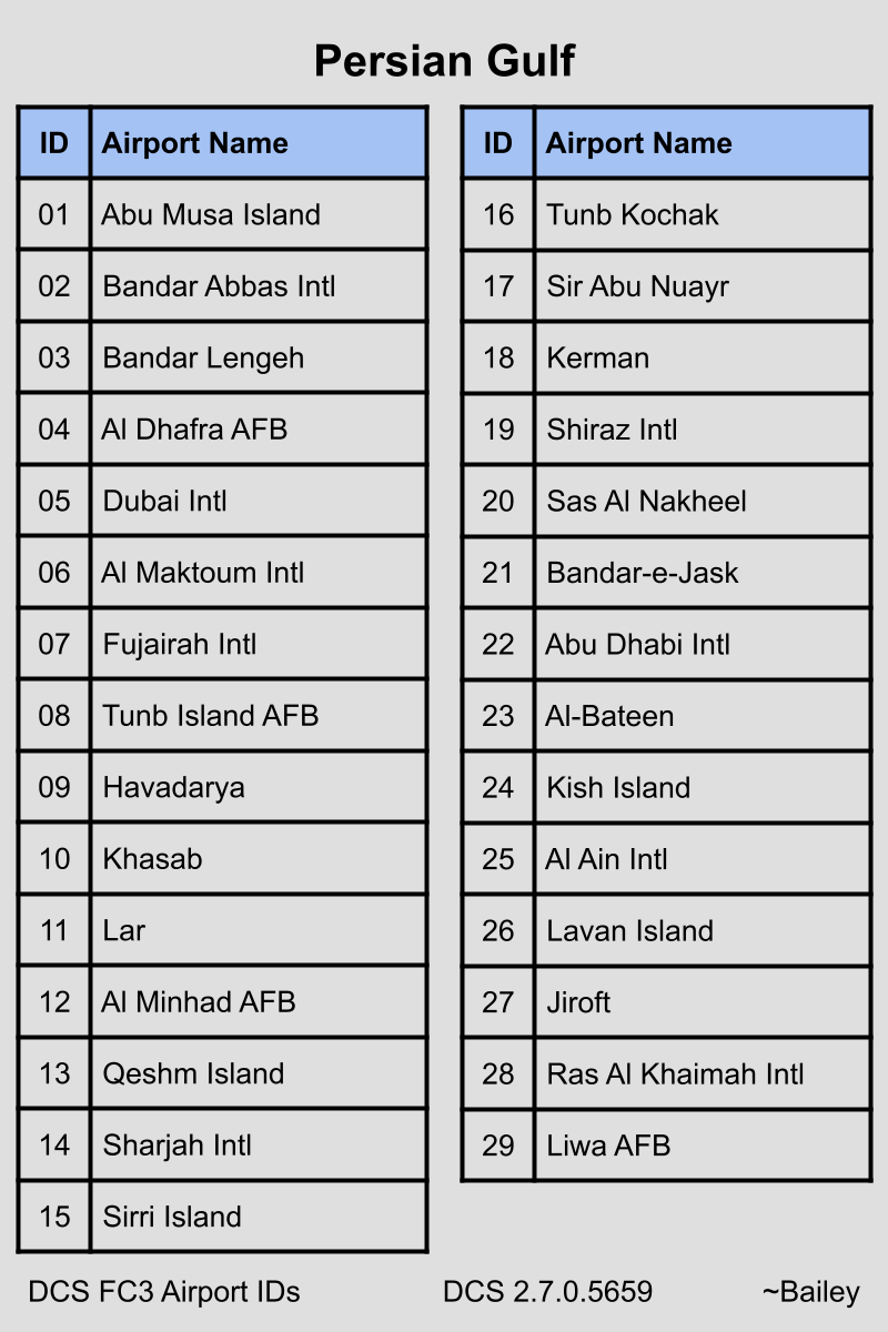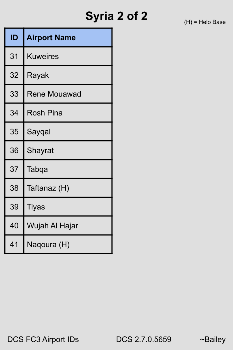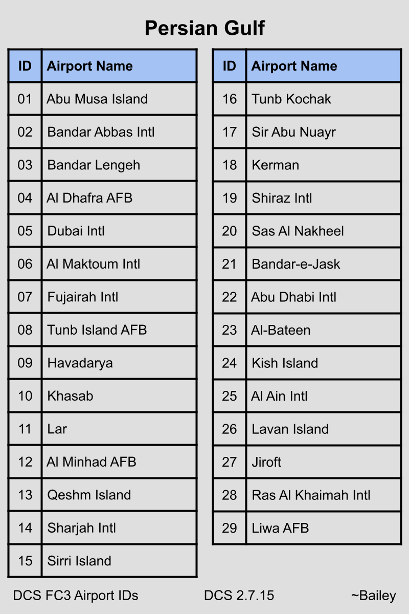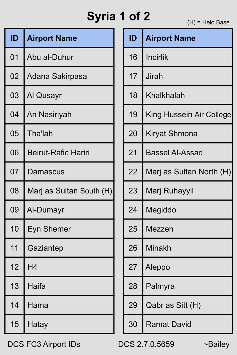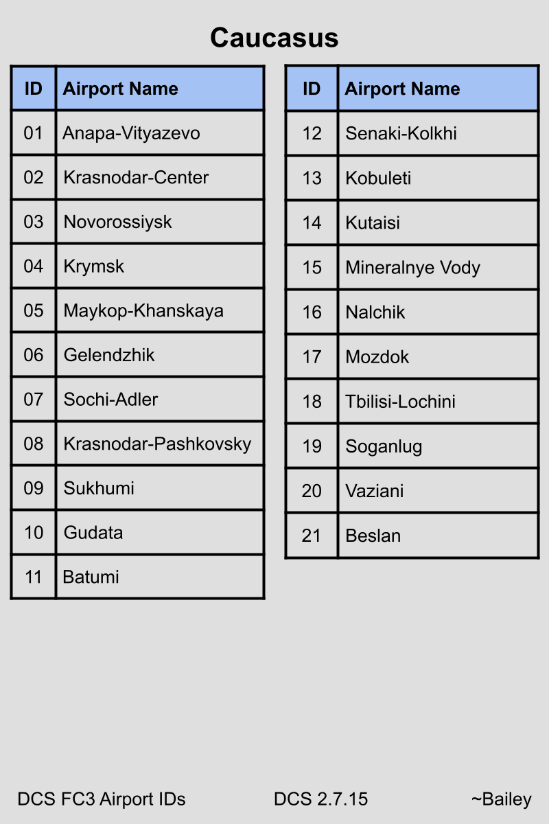 Are we there yet? Where is there? Find there with these kneeboards. Airports and their FC3 IDs for Caucasus, Persian Gulf, Nevada, Syria, and all other DCS maps. Simple and easy.