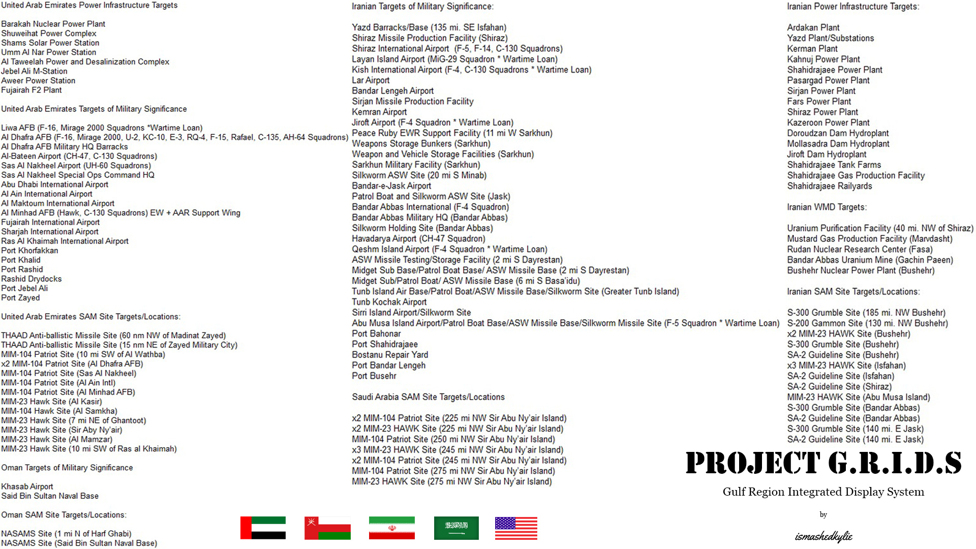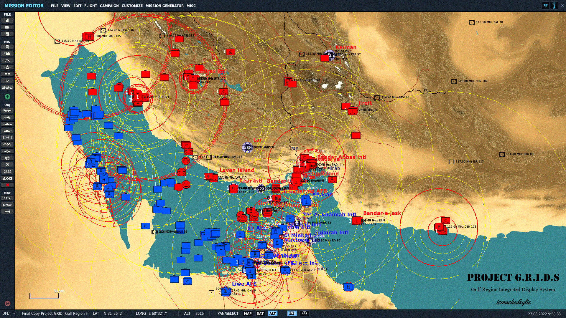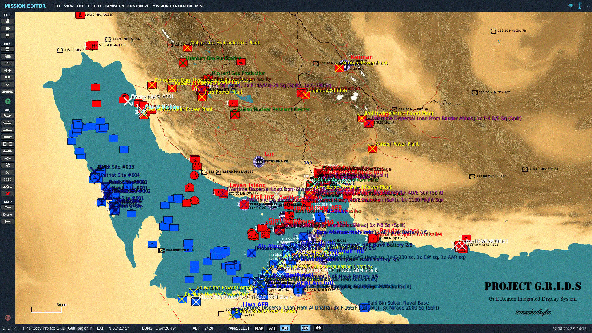 An upgraded .miz mission file for the Persian Gulf that combines the following maps: Persian Gulf Oil Rigs Static Template by Minsky, Persian Gulf SAM, EWR, and Strategic Infrastructure (V 0.99.2) Map by P. Arnold, and Realistic Persian Gulf Map - Easy by static_actual. ALL UPDATES LISTED IN SCREENSHOTS. MASSIVLEY updated all three original maps into one. Includes hundreds of strategic infrastructural, military, WMD, and air defense targets for Iran, Oman, the UAE, and Saudi Arabia cohesively. Now provides thousands of static targets for nearly every strategic site included on the entire map. Accounts for theoretical wartime placements to ensure an equal spread/distribution of strategic assets in an actual “shooting war scenario”. SAM sites were placed according to research, accuracy, and theoretical placements, and include both detailed and undetailed map areas. 130+ oil rigs accurately mapped and place with the help of MarineTraffic, Infield, ArcGIS, etc, and hidden by default.
