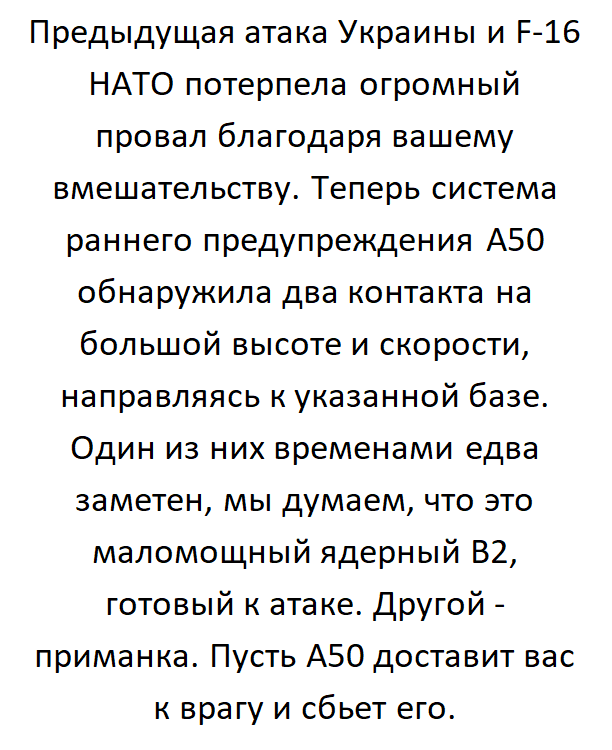 El anterior ataque de Ucrania y los F16 de la OTAN supuso un gran fracaso gracias a tu intervencion. Ahora un A50 de alerta temprana ha localizado dos contactos a gran altura y velocidad que se dirigen a dicha base. Uno de ellos apenas es visible por momentos, pensamos que es un B2 con armas nucleares de baja potencia preparado para atacar. El otro el un señuelo. Haz que el A50 te lleve al enemigo y derribalo.