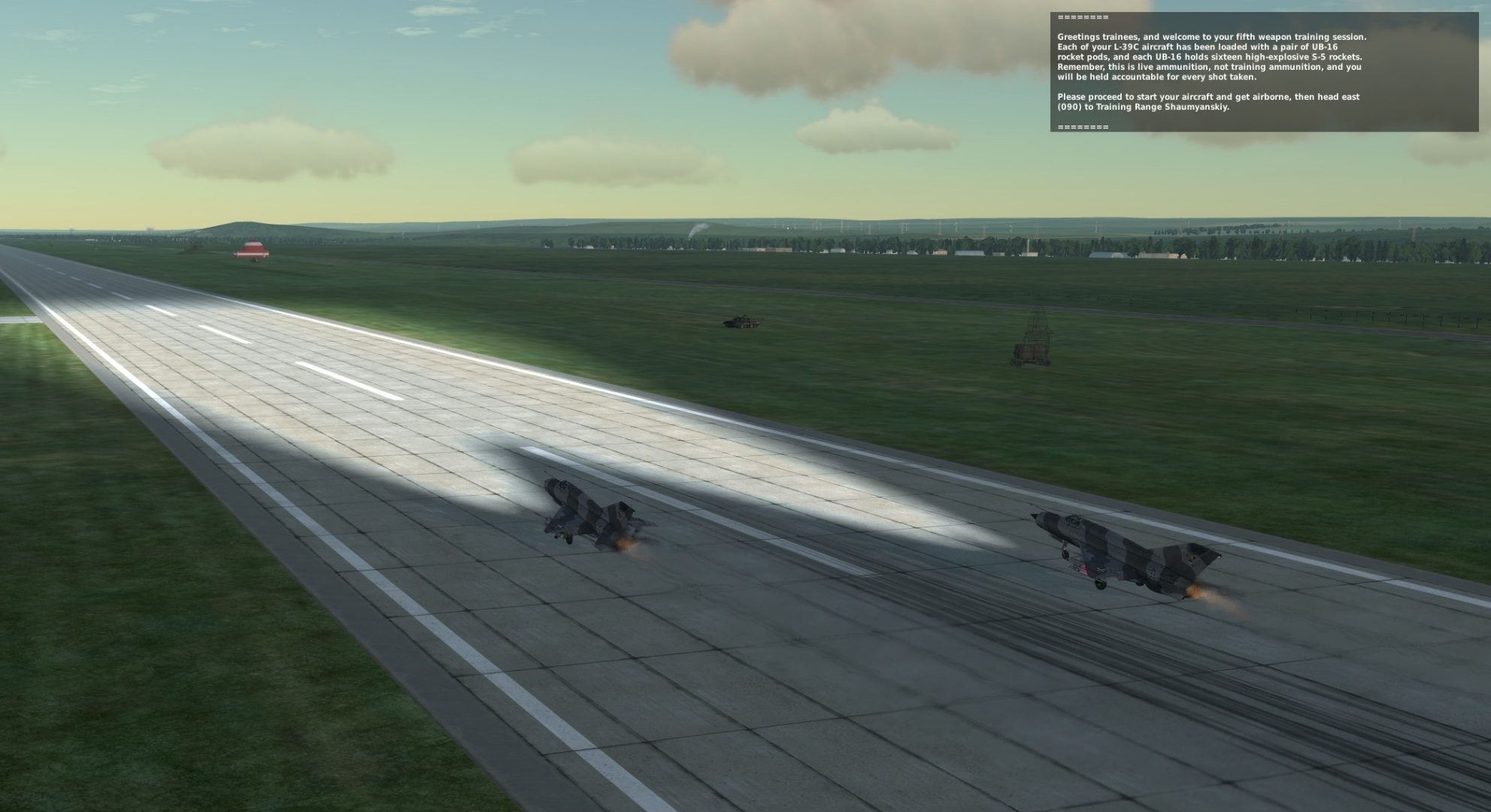 "Good evening, everyone.  We have received intelligence that a high value target is camped out in a mountain valley north of Kutaisi.  The mission tonight is simple: Take out the target.  There's not a lot of maneuvering room in the valley, so Dodge flight, a single F-18 will go in alone armed with rockets.  A single Apache, Springfield flight, will be standing by for additional CAS.  Uzi will be on station over the camp providing forward air control, and will designate targets as needed.  Overlord will provide mission command.  Additional details will be provided after startup."